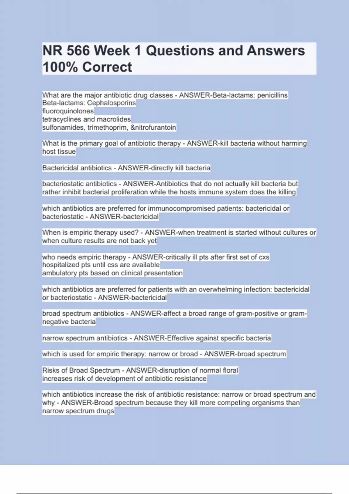 NR 566 Week 1 Questions and Answers 100% CorrectNR 566 Week 1 Questions and Answers 100% CorrectNR 566 Week 1 Questions and Answers 100% CorrectNR 566 Week 1 Questions and Answers 100% Correct What are the major antibiotic drug classes - ANSWER-Beta-lactams: penicillins Beta-lactams: Cephalosporins fluoroquinolones tetracyclines and macrolides sulfonamides, trimethoprim, &nitrofurantoin What is the primary goal of antibiotic therapy - ANSWER-kill bacteria without harming host tissue Bactericidal antibiotics - ANSWER-directly kill bacteria bacteriostatic antibiotics - ANSWER-Antibiotics that do not actually kill bacteria but rather inhibit bacterial proliferation while the hosts immune system does the killing