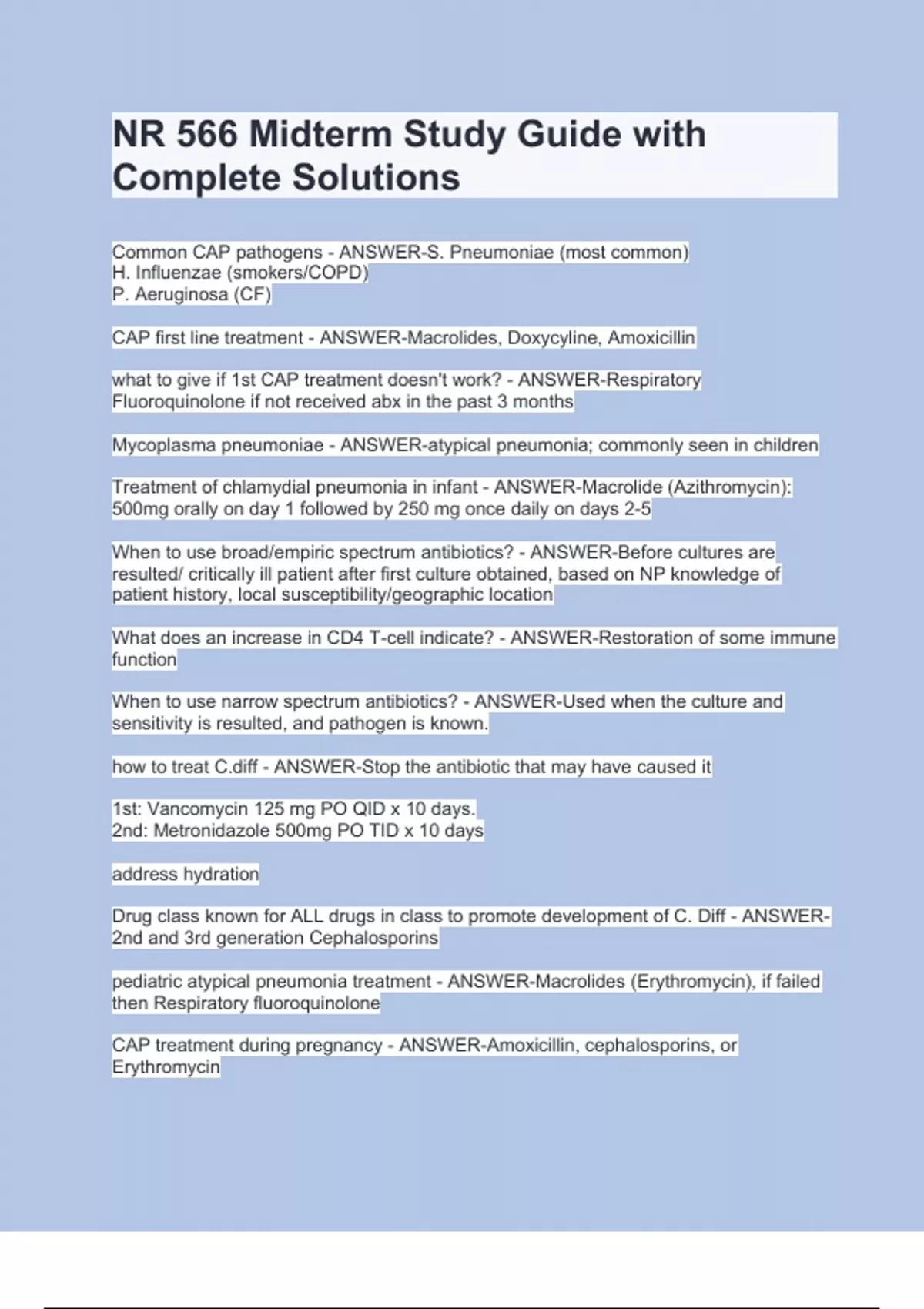 NR 566 Midterm Study Guide with Complete SolutionsNR 566 Midterm Study Guide with Complete SolutionsNR 566 Midterm Study Guide with Complete SolutionsNR 566 Midterm Study Guide with Complete Solutions Common CAP pathogens - ANSWER-S. Pneumoniae (most common) H. Influenzae (smokers/COPD) P. Aeruginosa (CF) CAP first line treatment - ANSWER-Macrolides, Doxycyline, Amoxicillin what to give if 1st CAP treatment doesn't work? - ANSWER-Respiratory Fluoroquinolone if not received abx in the past 3 months