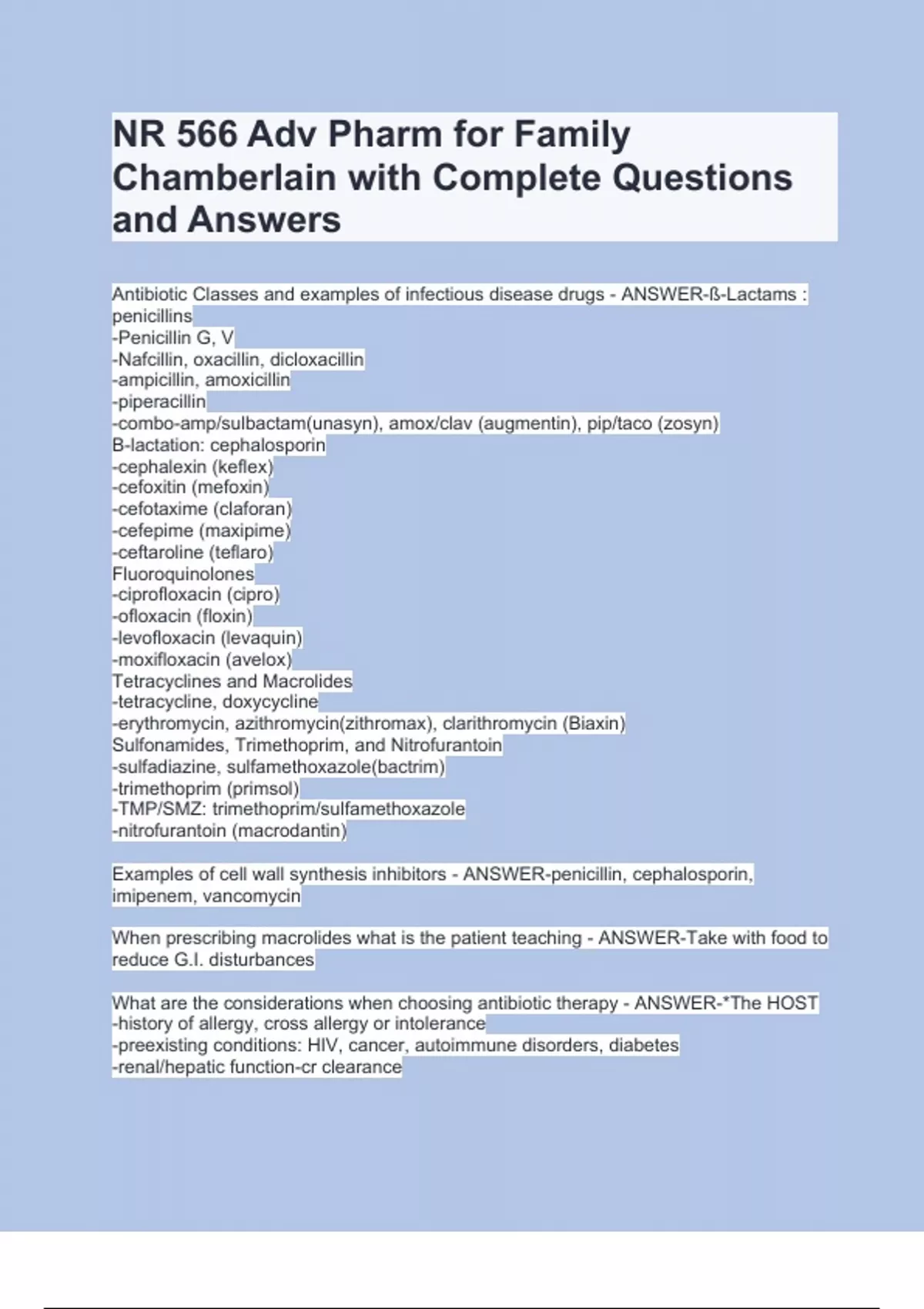 NR 566 Adv Pharm for Family Chamberlain with Complete Questions and AnswersNR 566 Adv Pharm for Family Chamberlain with Complete Questions and AnswersNR 566 Adv Pharm for Family Chamberlain with Complete Questions and AnswersNR 566 Adv Pharm for Family Chamberlain with Complete Questions and Answers Antibiotic Classes and examples of infectious disease drugs - ANSWER-ß-Lactams : penicillins -Penicillin G, V -Nafcillin, oxacillin, dicloxacillin -ampicillin, amoxicillin -piperacillin -combo-amp/sulbactam(unasyn), amox/clav (augmentin), pip/taco (zosyn) B-lactation: cephalosporin -cephalexin (keflex) -cefoxitin (mefoxin) -cefotaxime (claforan) -cefepime (maxipime) -ceftaroline (teflaro) Fluoroquinolones -ciprofloxacin (cipro) -ofloxacin (floxin) -levofloxacin (levaquin) -moxifloxacin (avelox) Tetracyclines and Macrolides -tetracycline, doxycycline -erythromycin, azithromycin(zithromax), clarithromycin (Biaxin) Sulfonamides, Trimethoprim, and Nitrofurantoin -sulfadiazine, sulfamethoxazole(bactrim) -trimethoprim (primsol) -TMP/SMZ: trimethoprim/sulfamethoxazole -nitrofurantoin (macrodantin) Examples of cell wall synthesis inhibitors - ANSWER-penicillin, cephalosporin, imipenem, vancomycin When prescribing macrolides what is the patient teaching - ANSWER-Take with food to reduce G.I. disturbances
