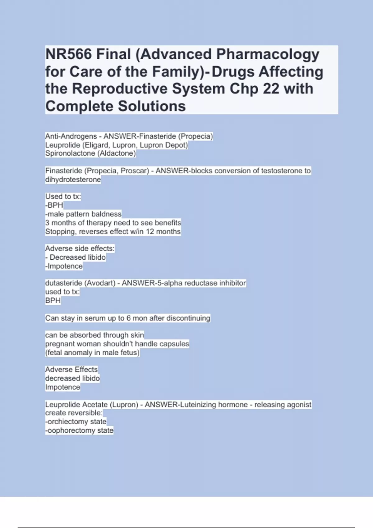NR566 Final (Advanced Pharmacology for Care of the Family)- Drugs Affecting the Reproductive System Chp 22 with Complete SolutionsNR566 Final (Advanced Pharmacology for Care of the Family)- Drugs Affecting the Reproductive System Chp 22 with Complete SolutionsNR566 Final (Advanced Pharmacology for Care of the Family)- Drugs Affecting the Reproductive System Chp 22 with Complete Solutions Anti-Androgens - ANSWER-Finasteride (Propecia) Leuprolide (Eligard, Lupron, Lupron Depot) Spironolactone (Aldactone) Finasteride (Propecia, Proscar) - ANSWER-blocks conversion of testosterone to dihydrotesterone Used to tx: -BPH -male pattern baldness