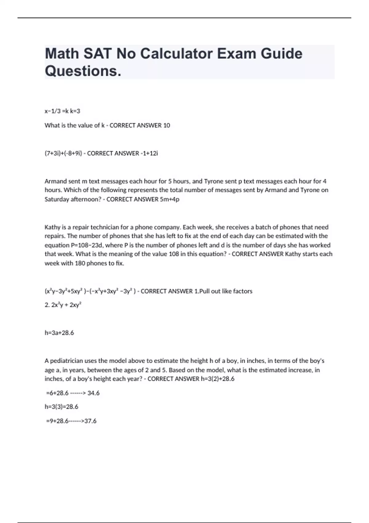 Math SAT No Calculator Exam Guide Questions. x−1/3 =k k=3 What is the value of k - CORRECT ANSWER 10 (7+3i)+(-8+9i) - CORRECT ANSWER -1+12i Armand sent m text messages each hour for 5 hours, and Tyrone sent p text messages each hour for 4 hours. Which of the following represents the total number of messages sent by Armand and Tyrone on Saturday afternoon? - CORRECT ANSWER 5m+4p Kathy is a repair technician for a phone company. Each week, she receives a batch of phones that need repairs. The number of phones that she has left to fix at the end of each day can be estimated with the equation P=108−23d, where P is the number of phones left and d is the number of days she has worked that week. What is the meaning of the value 108 in this equation? - CORRECT ANSWER Kathy starts each week with 180 phones to fix. (x²y−3y²+5xy² )−(−x²y+3xy² −3y² ) - CORRECT ANSWER 1.Pull out like factors 2. 2x²y + 2xy² h=3a+28.6 A pediatrician uses the model above to estimate the height h of a boy, in inches, in terms of the boy's age a, in years, between the ages of 2 and 5. Based on the model, what is the estimated increase, in inches, of a boy's height each year? - CORRECT ANSWER h=3(2)+28.6 =6+28.6 ------ 34.6 h=3(3)=28.6 =9+28.6------37.6