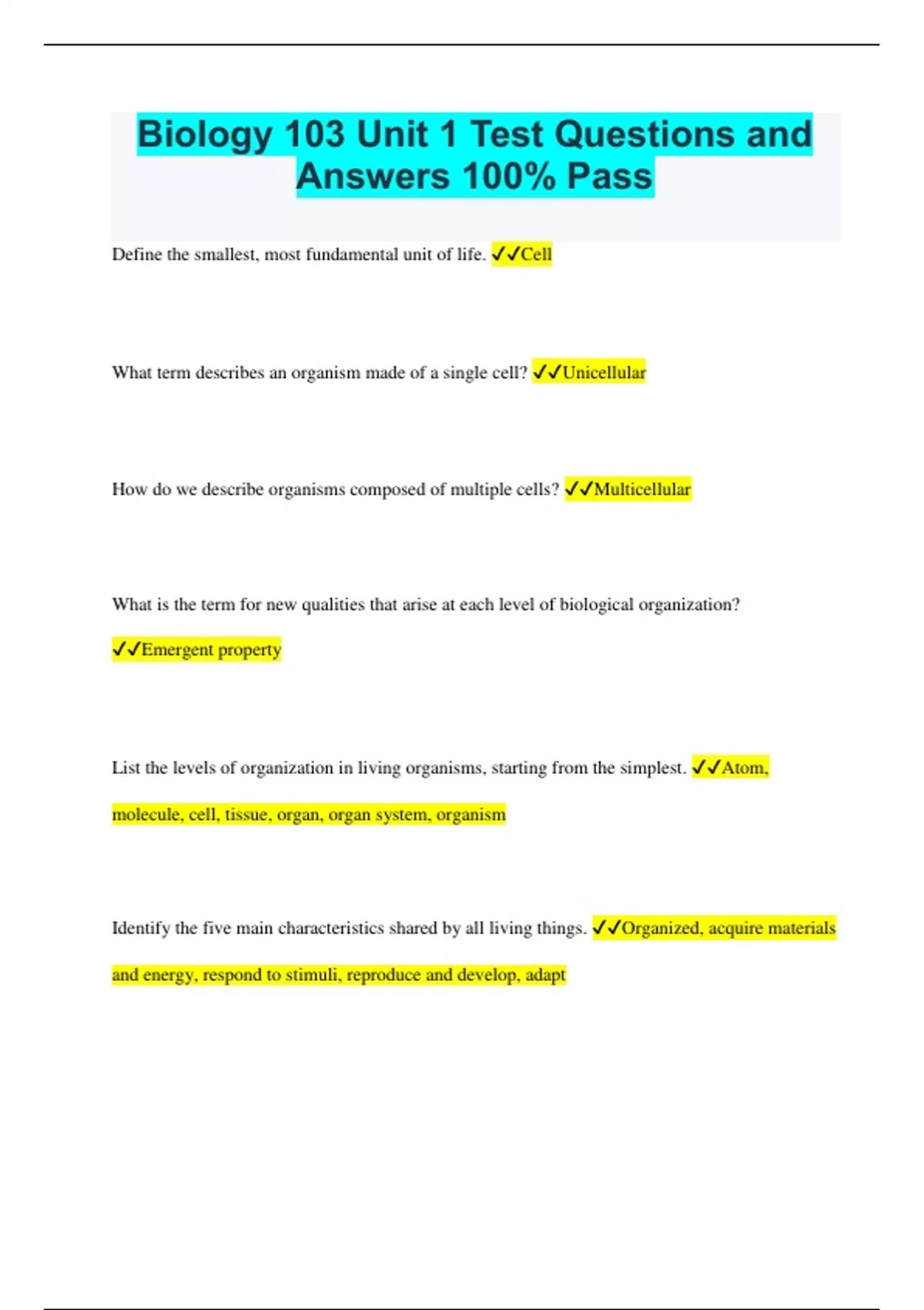 Biology 103 Unit 1 Test Questions and Answers 100% Pass Define the smallest, most fundamental unit of life. Cell What term describes an organism made of a single cell? Unicellular How do we describe organisms composed of multiple cells? Multicellular What is the term for new qualities that arise at each level of biological organization? Emergent property List the levels of organization in living organisms, starting from the simplest. Atom, molecule, cell, tissue, organ, organ system, organism Identify the five main characteristics shared by all living things. Organized, acquire materials and energy, respond to stimuli, reproduce and develop, adapt Describe the process by which organisms become better suited to their environment. Natural selection What term refers to the gradual change in species over time? Evolution Arrange the classification categories from most specific to most general. Species, Genus, Family, Order, Class, Phylum, Kingdom, Domain What is the scientific discipline that involves identifying and classifying organisms? Taxonomy Name the three domains of life. Bacteria, Archaea, Eukarya What characteristics describe the domain Bacteria? Microscopic, asexual, unicellular prokaryotes (e.g., strep, staph, plaque on teeth) Archea unicellular asexual extreme environment Eukarya most primitive bacteria-like uni/multicellular asexual reproduction membrane-bound nucleus 4 kingdoms live in extreme environments; methanogens (live in animal intestines, explosive), halophiles (live & thrive in salty environments), thermocidophiles (survive in high temps and acidic environments) List the 4 kingdoms of Eukarya. protista fungi plantae animalia