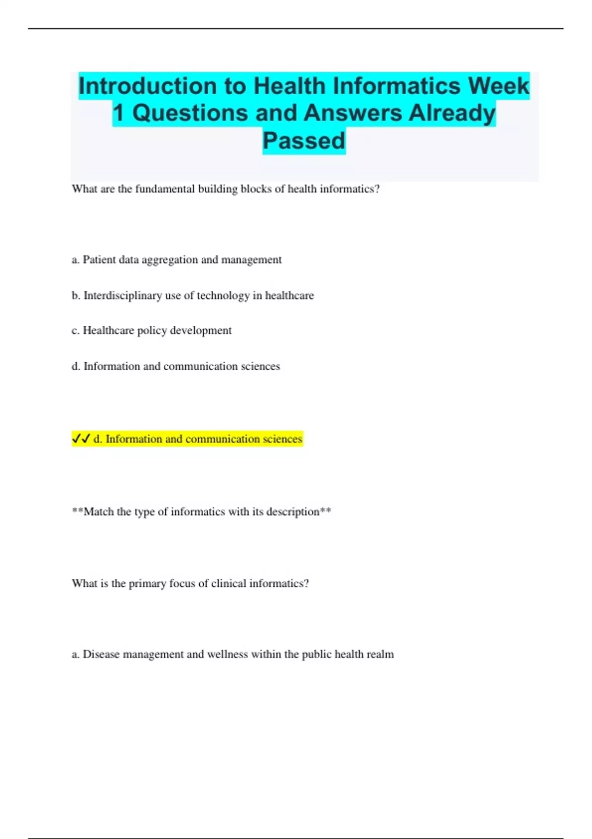 Introduction to Health Informatics Week 1 Questions and Answers Already Passed What are the fundamental building blocks of health informatics? a. Patient data aggregation and management b. Interdisciplinary use of technology in healthcare c. Healthcare policy development d. Information and communication sciences d. Information and communication sciences **Match the type of informatics with its description** What is the primary focus of clinical informatics? a. Disease management and wellness within the public health realm b. Interdisciplinary approach to using technology to plan, diagnose, and manage healthcare services c. **Supports patient care, research, and development of standards and policy** d. Determines how information is communicated within biological systems c. Supports patient care, research, and development of standards and policy **What is the ultimate goal of nursing informatics?** What is the purpose of nursing informatics in healthcare? a. Improves decision-making and positive patient outcomes b. **To promote high-quality patient care through the effective use of technology and information** c. Increases quality of care d. Manages patient data b. To promote high-quality patient care through the effective use of technology and information **How does informatics impact patient care?** In what ways does informatics contribute to improved patient outcomes? a. Tracks essential indicators, such