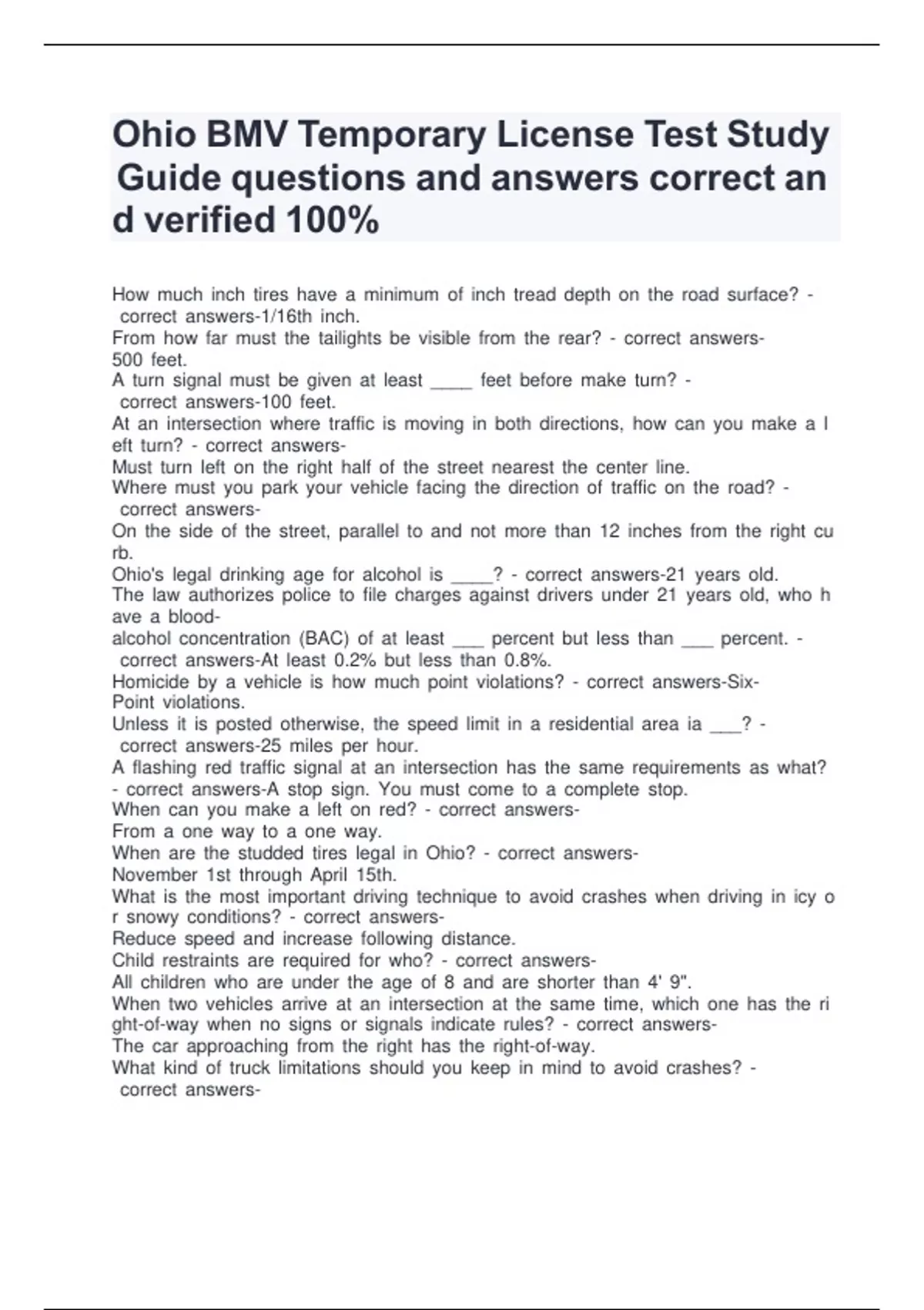 Ohio BMV Temporary License Test Study Guide questions and answers correct and verified 100%Ohio BMV Temporary License Test Study Guide questions and answers correct and verified 100%Ohio BMV Temporary License Test Study Guide questions and answers correct and verified 100%Ohio BMV Temporary License Test Study Guide questions and answers correct and verified 100%Ohio BMV Temporary License Test Study Guide questions and answers correct and verified 100%Ohio BMV Temporary License Test Study Guide questions and answers correct and verified 100%