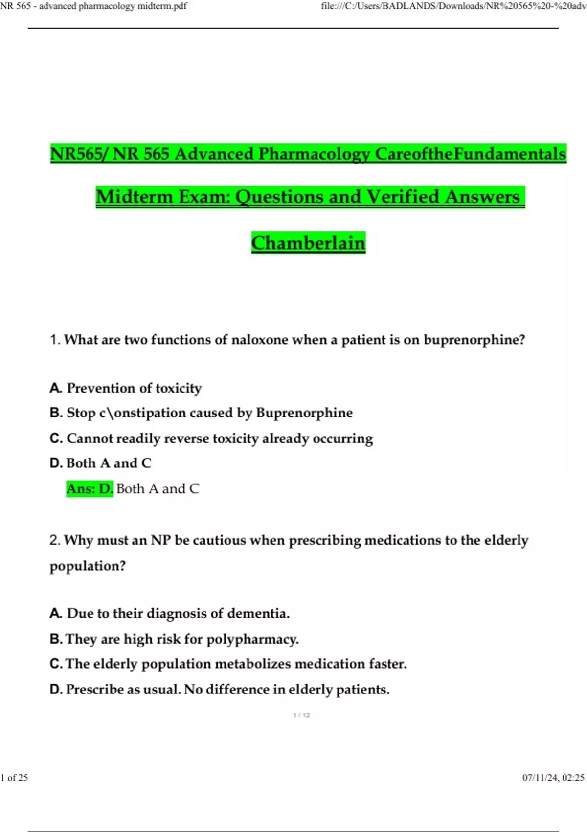 NR565 / NR 565 Midterm Exam: Advanced Pharmacology Fundamentals Exam|Questions and Verified Answers|Latest 2024 / 2025 Update - Chamberlain