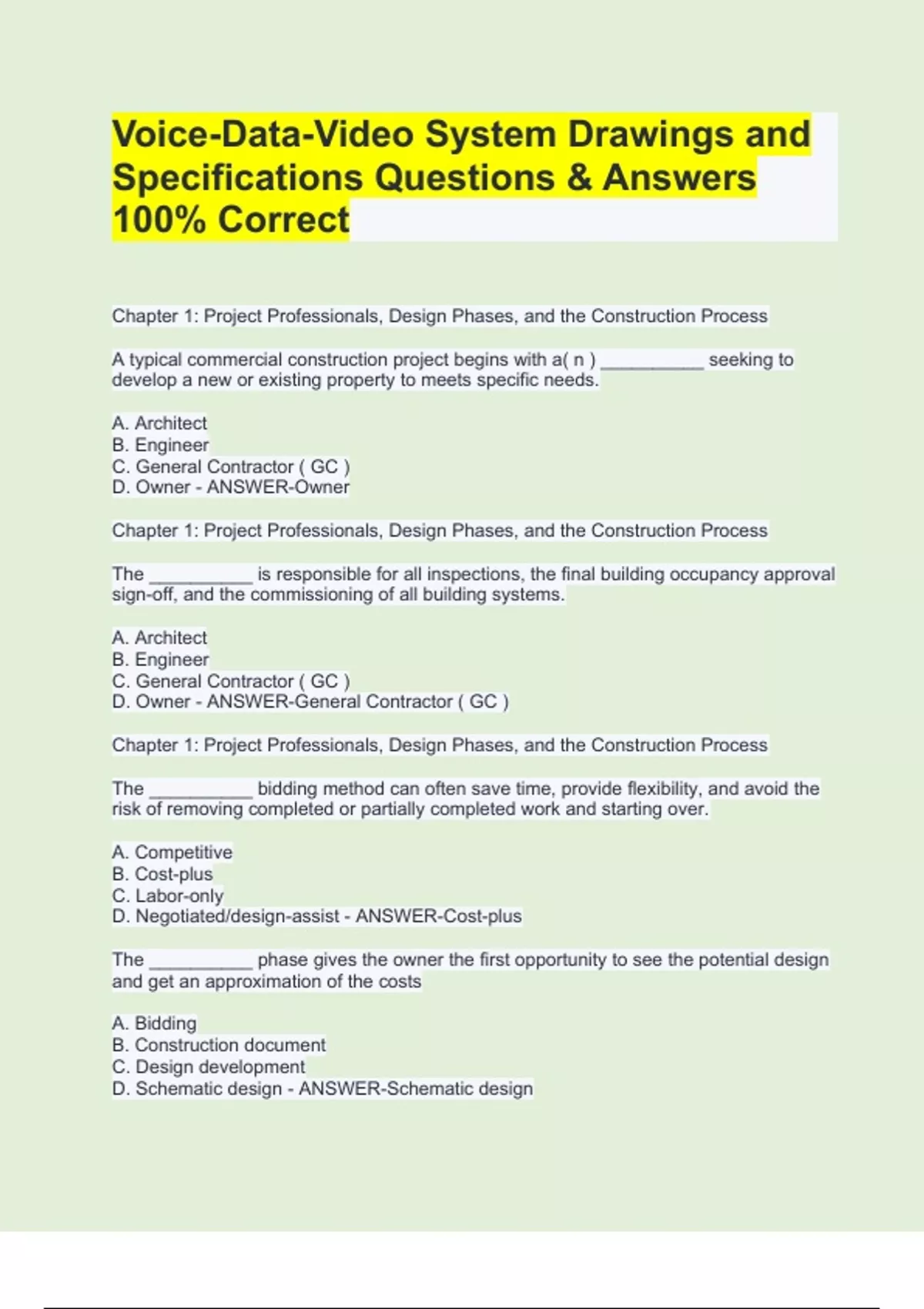 Voice-Data-Video System Drawings and Specifications Questions & Answers 100% CorrectVoice-Data-Video System Drawings and Specifications Questions & Answers 100% CorrectVoice-Data-Video System Drawings and Specifications Questions & Answers 100% CorrectVoice-Data-Video System Drawings and Specifications Questions & Answers 100% Correct Chapter 1: Project Professionals, Design Phases, and the Construction Process A typical commercial construction project begins with a( n ) __________ seeking to develop a new or existing property to meets specific needs. A. Architect B. Engineer C. General Contractor ( GC ) D. Owner - ANSWER-Owner Chapter 1: Project Professionals, Design Phases, and the Construction Process