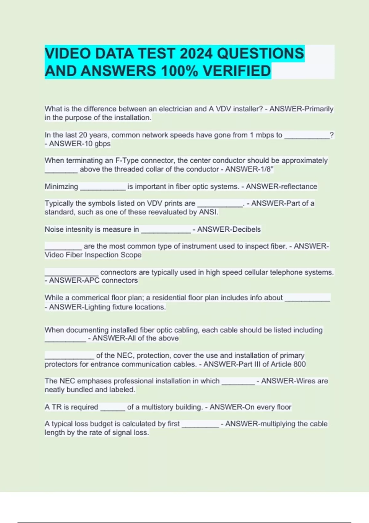 VIDEO DATA TEST 2024 QUESTIONS AND ANSWERS 100% VERIFIED VIDEO DATA TEST 2024 QUESTIONS AND ANSWERS 100% VERIFIED VIDEO DATA TEST 2024 QUESTIONS AND ANSWERS 100% VERIFIED What is the difference between an electrician and A VDV installer? - ANSWER-Primarily in the purpose of the installation. In the last 20 years, common network speeds have gone from 1 mbps to ___________? - ANSWER-10 gbps When terminating an F-Type connector, the center conductor should be approximately ________ above the threaded collar of the conductor - ANSWER-1/8"