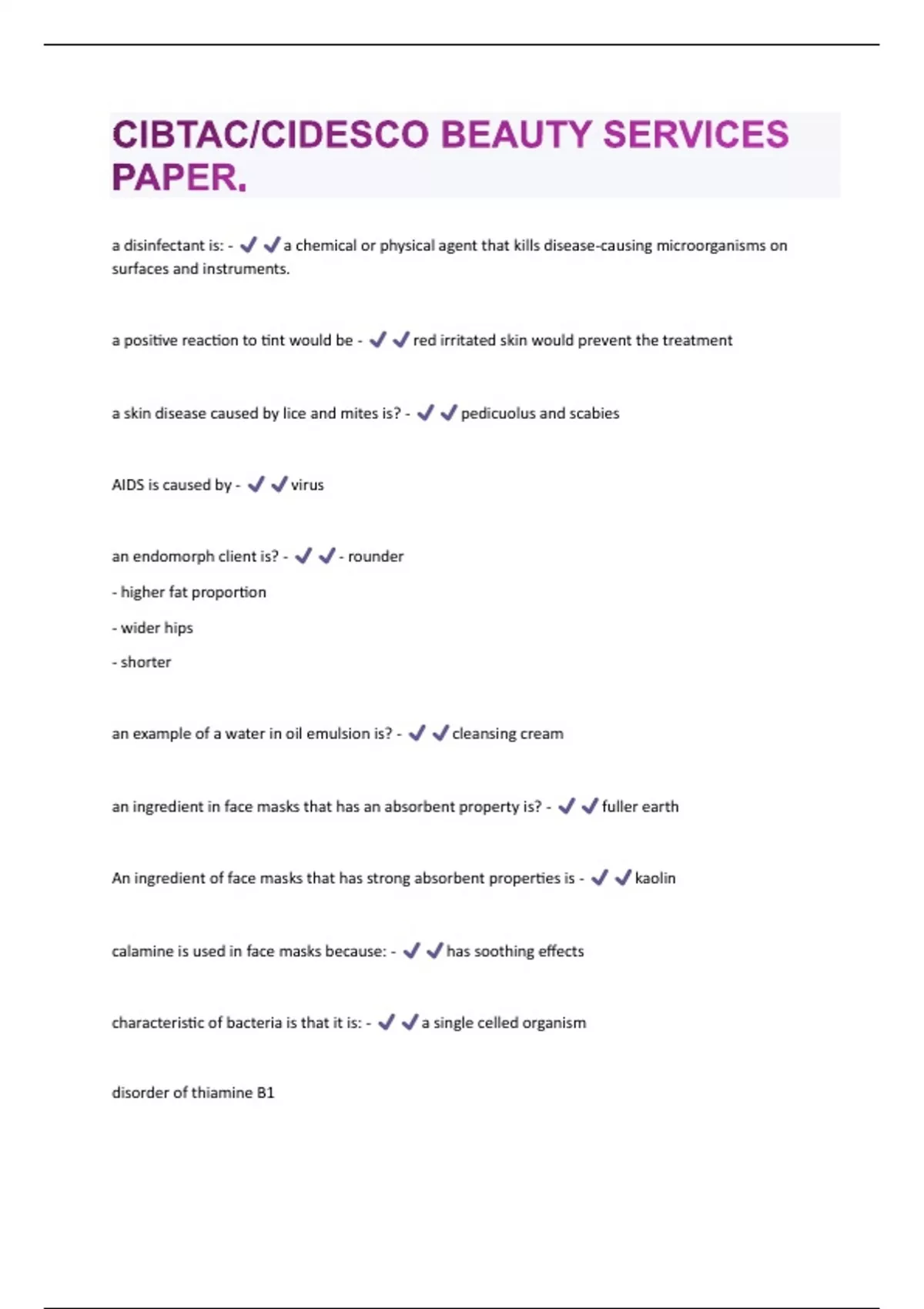 a disinfectant is: - a chemical or physical agent that kills disease-causing microorganisms on surfaces and instruments. a positive reaction to tint would be - red irritated skin would prevent the treatment a skin disease caused by lice and mites is? - pedicuolus and scabies AIDS is caused by - virus an endomorph client is? - - rounder - higher fat proportion - wider hips - shorter an example of a water in oil emulsion is? - cleansing cream an ingredient in face masks that has an absorbent property is? - fuller earth An ingredient of face masks that has strong absorbent properties is - kaolin calamine is used in face masks because: - has soothing effects characteristic of bacteria is that it is: - a single celled organism disorder of thiamine B1- water balance - nervous system - beri beri disorder of vitamin B2 - healthy skin - antioxidant - pAllegra do frictions soothe nerve paths and frees adhesions of the muslce? - yes does disinfectant kill all spores? - false effleurage can be described as a? - stroking movement eyebrows are tinted before plucking because - less risk of irritating the skin fat can be described as a... - nutrient function of the hair is too: - protect the body hepatitis is: - a virus of inflammation of the liver how do you apply wax? - at a 90 degree angle how is a pustule described? - a red raised lump with a white pus head on top. how is dehydrated skin described? - lack of water in the skin how is impetigo described? - honey coloured crust rashhow long does catagen stage last? - 14 days how long does tinting last? - up to 6 weeks how should you sterilise needes? - gamma radiation how would you apply strip lashes? - be infront of the client