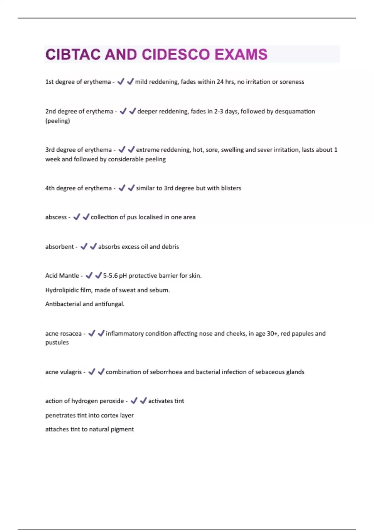 1st degree of erythema - mild reddening, fades within 24 hrs, no irritation or soreness 2nd degree of erythema - deeper reddening, fades in 2-3 days, followed by desquamation (peeling) 3rd degree of erythema - extreme reddening, hot, sore, swelling and sever irritation, lasts about 1 week and followed by considerable peeling 4th degree of erythema - similar to 3rd degree but with blisters abscess - collection of pus localised in one area absorbent - absorbs excess oil and debris Acid Mantle - 5-5.6 pH protective barrier for skin. Hydrolipidic film, made of sweat and sebum. Antibacterial and antifungal. acne rosacea - inflammatory condition affecting nose and cheeks, in age 30+, red papules and pustules acne vulagris - combination of seborrhoea and bacterial infection of sebaceous glands action of hydrogen peroxide - activates tint penetrates tint into cortex layer attaches tint to natural pigmentActivators - rose water - mild, tonic effect, increases action of mask ingredients orange flower water- slightly stimulating, tonic effect cucumber juice - balances pH lavender water - calming and soothing witch hazel - astringent, stimulating, toning, drying almond oil - lubricating glycerine - softening grapeseed oil - light and soothing ACTIVE AGENTS - cause change in appearance of skin Active Bacteria - Full growth in 20-30 minutes active ingredients - alcohol lanolin collagen placenta water demineralised water hard water soft waterActive Transport Carriers Endocytosis Phagocytosis Pinocytosis Exocytosis - Movement from lower concentration to higher, energy is required