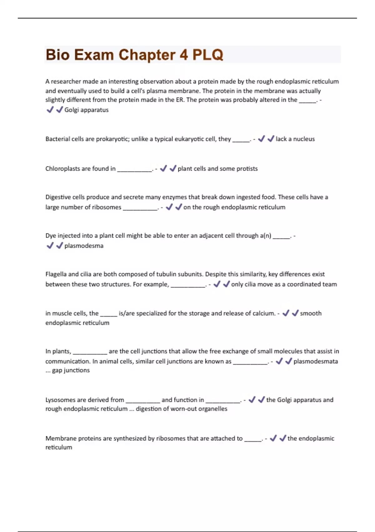 A researcher made an interesting observation about a protein made by the rough endoplasmic reticulum and eventually used to build a cell's plasma membrane. The protein in the membrane was actually slightly different from the protein made in the ER. The protein was probably altered in the _____. - Golgi apparatus Bacterial cells are prokaryotic; unlike a typical eukaryotic cell, they _____. - lack a nucleus Chloroplasts are found in __________. - plant cells and some protists Digestive cells produce and secrete many enzymes that break down ingested food. These cells have a large number of ribosomes __________. - on the rough endoplasmic reticulum Dye injected into a plant cell might be able to enter an adjacent cell through a(n) _____. - plasmodesma Flagella and cilia are both composed of tubulin subunits. Despite this similarity, key differences exist between these two structures. For example, __________. - only cilia move as a coordinated team in muscle cells, the _____ is/are specialized for the storage and release of calcium. - smooth endoplasmic reticulum In plants, __________ are the cell junctions that allow the free exchange of small molecules that assist in communication. In animal cells, similar cell junctions are known as __________. - plasmodesmata ... gap junctions Lysosomes are derived from __________ and function in __________. - the Golgi apparatus and rough endoplasmic reticulum ... digestion of worn-out organelles Membrane proteins are synthesized by ribosomes that are attached to _____. - the endoplasmic reticulumMitochondria and chloroplasts are similar in that they both __________; however, they are different in that only chloroplasts, and not mitochondria, __________. - have a double membrane ... carry out photosynthesis Mitochondria appear in the greatest numbers in cells that are _____. - metabolically active Mitochondria are found in _____. - both plant cells and animal cells Most of the DNA in a eukaryotic cell is in the _____. - nucleus