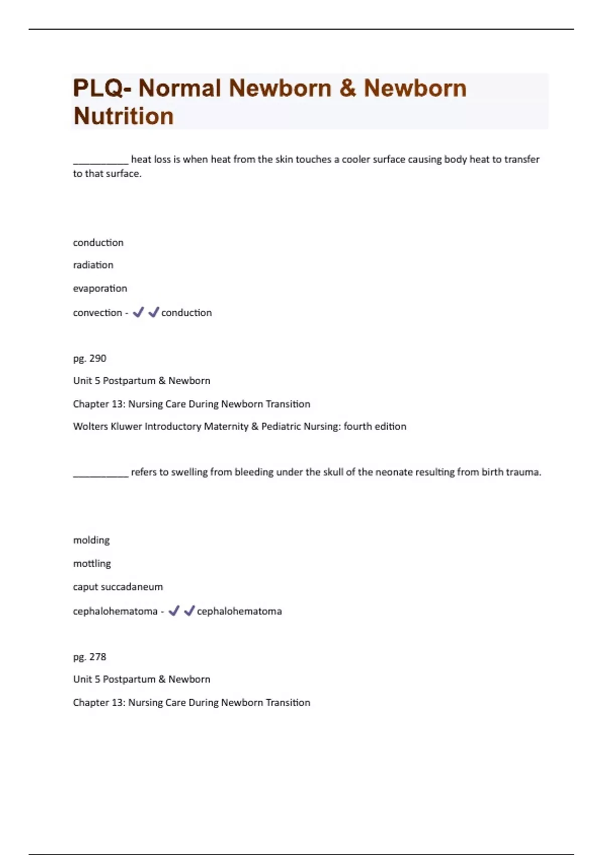 __________ heat loss is when heat from the skin touches a cooler surface causing body heat to transfer to that surface. conduction radiation evaporation convection - conduction pg. 290 Unit 5 Postpartum & Newborn Chapter 13: Nursing Care During Newborn Transition Wolters Kluwer Introductory Maternity & Pediatric Nursing: fourth edition __________ refers to swelling from bleeding under the skull of the neonate resulting from birth trauma. molding mottling caput succadaneum cephalohematoma - cephalohematoma pg. 278 Unit 5 Postpartum & Newborn Chapter 13: Nursing Care During Newborn TransitionWolters Kluwer Introductory Maternity & Pediatric Nursing: fourth edition A newborn usually loses approximately 20% of his or her birth weight during the first three to five days of life. True/False? - False pg. 275 Unit 5 Postpartum & Newborn Chapter 13: Nursing Care During Newborn Transition Wolters Kluwer Introductory Maternity & Pediatric Nursing: fourth edition A woman with mastitis should stop breast-feeding as soon as the diagnosis of infection is made by the provider. True/False? - False pg. 317 Unit 5 Postpartum & Newborn Chapter 15 Newborn Nutrition Wolters Kluwer Introductory Maternity & Pediatric Nursing - fourth edition A woman's decision to breast feed is influenced by culture, age, education, past experience with breastfeeding, and lifestyle. True/False? - True pg. 309 Unit 5 Postpartum & Newborn Chapter 15 Newborn NutritionWolters Kluwer Introductory Maternity & Pediatric Nursing - fourth edition An antibiotic ointment, like erythromycin, is placed in the newborn's eyes within an hour of birth to prevent ophthalmia neonatorum caused by __________ and chlamydia. syphilis herpes gonorrhea yeast - gonorrhea pg. 292 Unit 5 Postpartum & Newborn Chapter 14 Nursing Care of the Normal Newborn Wolters Kluwer Introductory Maternity & Pediatric Nursing: fourth edition Apgar scoring of the newborn is used to determine need for further resuscitation. True/False? - False pg. 272 Unit 5 Postpartum & Newborn Chapter 13: Nursing Care During Newborn Transition Wolters Kluwer Introductory Maternity & Pediatric Nursing: fourth edition Blood-tinged mucous on the diaper of a female newborn is a recognized as an expected assessment finding. True/False? - True pg. 281Unit 5 Postpartum & Newborn Chapter 13: Nursing Care During Newborn Transition Wolters Kluwer Introductory Maternity & Pediatric Nursing: fourth edition Breast-feeding is nutritionally superior to all types of milk. True/False? - True pg. 310 Unit 5 Postpartum & Newborn Chapter 15 Newborn Nutrition Wolters Kluwer Introductory Maternity & Pediatric Nursing - fourth edition
