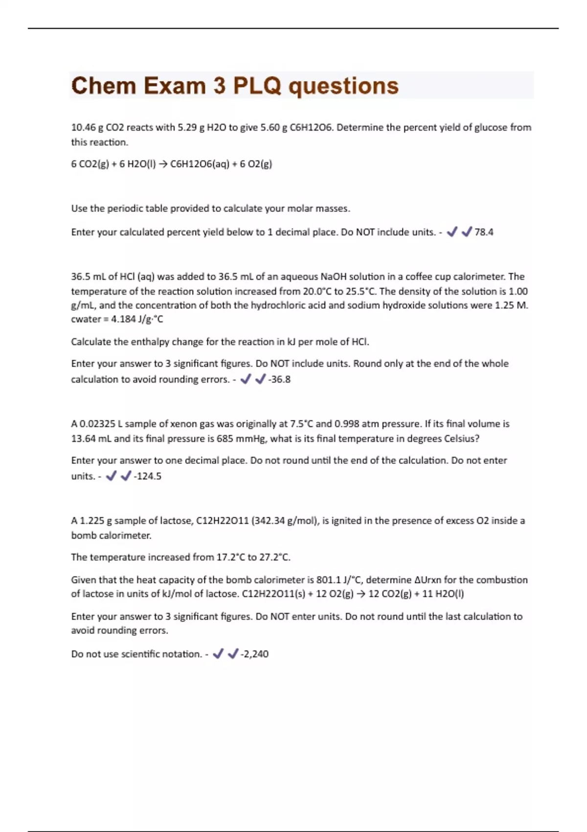 10.46 g CO2 reacts with 5.29 g H2O to give 5.60 g C6H12O6. Determine the percent yield of glucose from this reaction. 6 CO2(g) + 6 H2O(l) → C6H12O6(aq) + 6 O2(g) Use the periodic table provided to calculate your molar masses. Enter your calculated percent yield below to 1 decimal place. Do NOT include units. - 78.4 36.5 mL of HCl (aq) was added to 36.5 mL of an aqueous NaOH solution in a coffee cup calorimeter. The temperature of the reaction solution increased from 20.0°C to 25.5°C. The density of the solution is 1.00 g/mL, and the concentration of both the hydrochloric acid and sodium hydroxide solutions were 1.25 M. cwater = 4.184 J/g·°C Calculate the enthalpy change for the reaction in kJ per mole of HCl. Enter your answer to 3 significant figures. Do NOT include units. Round only at the end of the whole calculation to avoid rounding errors. - -36.8 A 0.02325 L sample of xenon gas was originally at 7.5°C and 0.998 atm pressure. If its final volume is 13.64 mL and its final pressure is 685 mmHg, what is its final temperature in degrees Celsius? Enter your answer to one decimal place. Do not round until the end of the calculation. Do not enter units. - -124.5 A 1.225 g sample of lactose, C12H22O11 (342.34 g/mol), is ignited in the presence of excess O2 inside a bomb calorimeter. The temperature increased from 17.2°C to 27.2°C. Given that the heat capacity of the bomb calorimeter is 801.1 J/°C, determine ΔUrxn for the combustion of lactose in units of kJ/mol of lactose. C12H22O11(s) + 12 O2(g) → 12 CO2(g) + 11 H2O(l) Enter your answer to 3 significant figures. Do NOT enter units. Do not round until the last calculation to avoid rounding errors. Do not use scientific notation. - -2,240A 13.98 g sample of a metal with a temperature of 85.25°C was placed in 8.45g of water at 12.12°C. The final temperature of the system was 18.46°C. Calculate the specific heat of the metal in units of J/g·°C to determine which of the metals in the table below it was most likely to have been. cwater = 4.184 J/g·°C chromium lead sodium zinc silver gold aluminum tin iron - silver A 15.25 g sample of a pure elemental metal with a temperature of 85.25°C was placed in 8.45 g of water at 12.12°C. The final temperature of the system was 18.46°C. Identify the metal element using the table below. cwater = 4.184 J/g·°C lead silver sodium chromium aluminum iron tin zinc gold - tin A 724 mL sample of argon gas, initially at 5.0°C, is heated at constant pressure. If the final volume of the gas is 0.958 L, what is the final temperature in °C?Do not round any number until your final answer during your calculation. Enter your answer to 3 significant figures. Do NOT include units. - 94.9 A gas, initially at 2.05 atm and 3.45 L, expands to a volume of 12.35 L. What is the new pressure of the gas in atmospheres? Enter your answer to the correct significant figures. Do NOT include units. - 0.573
