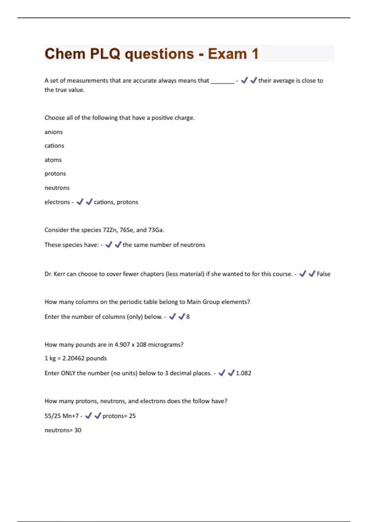 A set of measurements that are accurate always means that _______ - their average is close to the true value. Choose all of the following that have a positive charge. anions cations atoms protons neutrons electrons - cations, protons Consider the species 72Zn, 76Se, and 73Ga. These species have: - the same number of neutrons Dr. Kerr can choose to cover fewer chapters (less material) if she wanted to for this course. - False How many columns on the periodic table belong to Main Group elements? Enter the number of columns (only) below. - 8 How many pounds are in 4.907 x 108 micrograms? 1 kg = 2.20462 pounds Enter ONLY the number (no units) below to 3 decimal places. - 1.082 How many protons, neutrons, and electrons does the follow have? 55/25 Mn+7 - protons= 25 neutrons= 30electrons= 18 How many significant digits are in the number: 40800? - 3 How many significant figures are in the number: 0. In olden times, apothecaries used to dispense medicine using their own system of measurements that are listed below. Use the conversions below (and dimensional analysis) to determine how many milligrams would be in a sample of 1.250 scruples. Hint: You will have to convert kg to mg using the conversions you have memorized. 1 apothecary pound = 12 ounces 1 ounce = 8 drams 3 scruples = 1 dram 1.2153 apothecary pound = 1 English pound 1 kg = 2.205 English pounds Enter your answer to 4 significant digits. Do not include the units. - 1,620 In the formula unit: Ba3(PO4)2 how atoms many of each element are there? - Ba- 3, P- 2, O- 8 Match the element with its correct symbol. Argon Arsenic Tin Antimony Scandium Strontium - Ar, As, Sn, Sb, Sc, SrSelect all of the following that are chemical changes. -water melting -iron rusting -salt dissolving in water -wood burning -frying an egg - -iron rusting -wood burning -frying an egg The following measurements of the mass of an object were made by different people in a lab. Each set gives the results of three measurements followed by the average. Which set is the most precise? All values are in grams. The standard value of the object's mass reported by an analytical laboratory was 1.501 g. A.) 1.513, 1.503, 1.522 avg= 1.513 B.) 1.513, 1.511, 1.450 avg= 1.491 C.) 1.513, 1.459, 1.533 avg= 1.502 D.) 1.513, 1.517, 1.512 avg= 1.514 E.) 1.513, 1.510, 1.523 avg= 1.515 - D.) 1.513, 1.517, 1.512 avg= 1.514 The neutral atoms of all of the isotopes of the same element have: - the same number of electrons There are make up exams in this CHEM 1314 course. - False True or False: A student that has earned 75% on the PLQs, and iClicker questions would actually earn 100% for both of these grade items. - TrueTrue or False: Canvas is great at calculating overall grades. - False Two metal samples with the same volumes were weighed. One sample was iron and the other was copper. The two masses that were measured were 17.92 g and 15.74 g. Which mass corresponds to the copper sample, and which to the iron sample?What is the volume of both metals? Element: Iron/ Copper Density: 7.87 g/cm3/ 8.96 g/cm3 - Mass of Cu: 17.92 Mass of Fe: 15.74 Volume of both metals: 2.00 cubic centimeters What are the number of hours that students are expected to spend on this course outside of class and lab according to the 'Participation Expectations' part of the syllabus? - 8