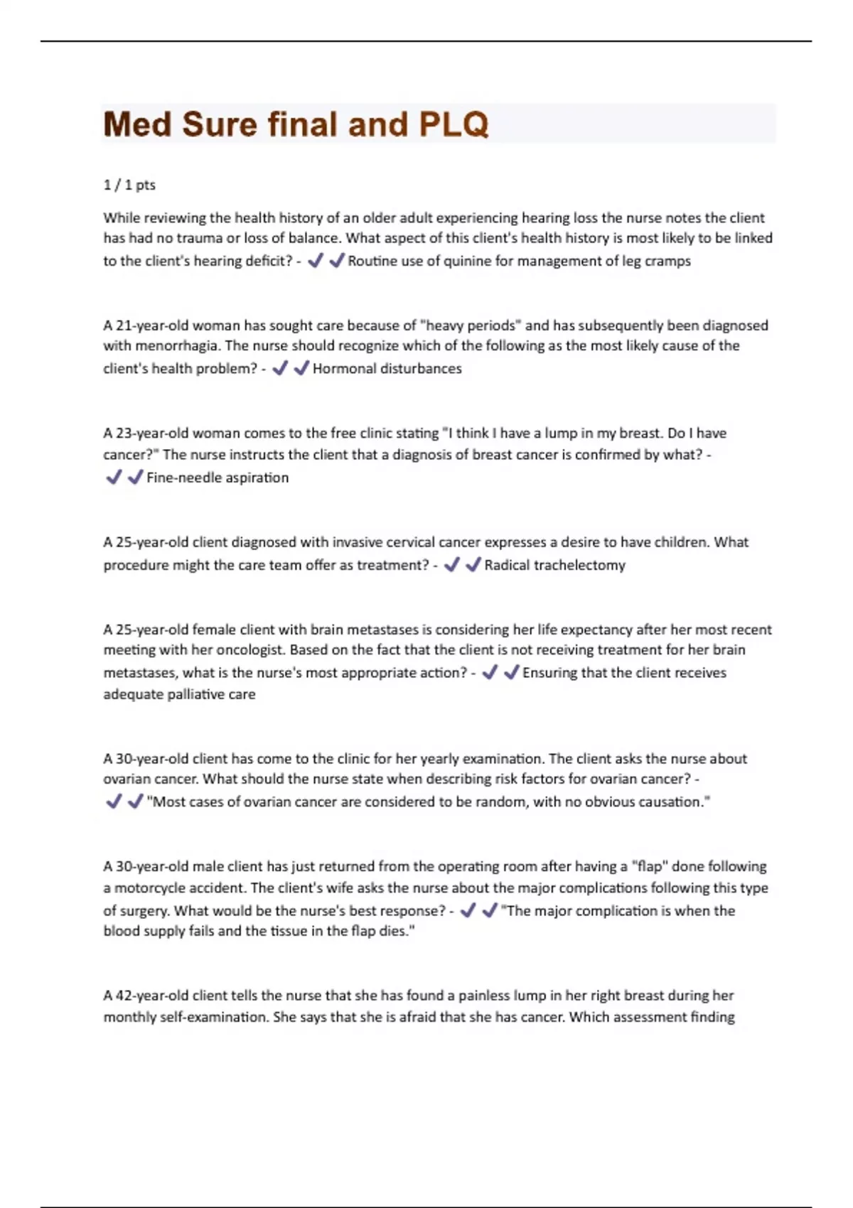 1 / 1 pts While reviewing the health history of an older adult experiencing hearing loss the nurse notes the client has had no trauma or loss of balance. What aspect of this client's health history is most likely to be linked to the client's hearing deficit? - Routine use of quinine for management of leg cramps A 21-year-old woman has sought care because of "heavy periods" and has subsequently been diagnosed with menorrhagia. The nurse should recognize which of the following as the most likely cause of the client's health problem? - Hormonal disturbances A 23-year-old woman comes to the free clinic stating "I think I have a lump in my breast. Do I have cancer?" The nurse instructs the client that a diagnosis of breast cancer is confirmed by what? - Fine-needle aspiration A 25-year-old client diagnosed with invasive cervical cancer expresses a desire to have children. What procedure might the care team offer as treatment? - Radical trachelectomy A 25-year-old female client with brain metastases is considering her life expectancy after her most recent meeting with her oncologist. Based on the fact that the client is not receiving treatment for her brain metastases, what is the nurse's most appropriate action? - Ensuring that the client receives adequate palliative care A 30-year-old client has come to the clinic for her yearly examination. The client asks the nurse about ovarian cancer. What should the nurse state when describing risk factors for ovarian cancer? - "Most cases of ovarian cancer are considered to be random, with no obvious causation." A 30-year-old male client has just returned from the operating room after having a "flap" done following a motorcycle accident. The client's wife asks the nurse about the major complications following this type of surgery. What would be the nurse's best response? - "The major complication is when the blood supply fails and the tissue in the flap dies." A 42-year-old client tells the nurse that she has found a painless lump in her right breast during her monthly self-examination. She says that she is afraid that she has cancer. Which assessment findingwould most strongly suggest that this client's lump is cancerous? - A nonmobile mass with irregular edges A 45-year-old woman comes into the health clinic for her annual checkup. She mentions to the nurse that she has noticed dimpling of the right breast that has occurred over a few months. What assessment would be most appropriate for the nurse to make? - Palpate the area for a breast mass
