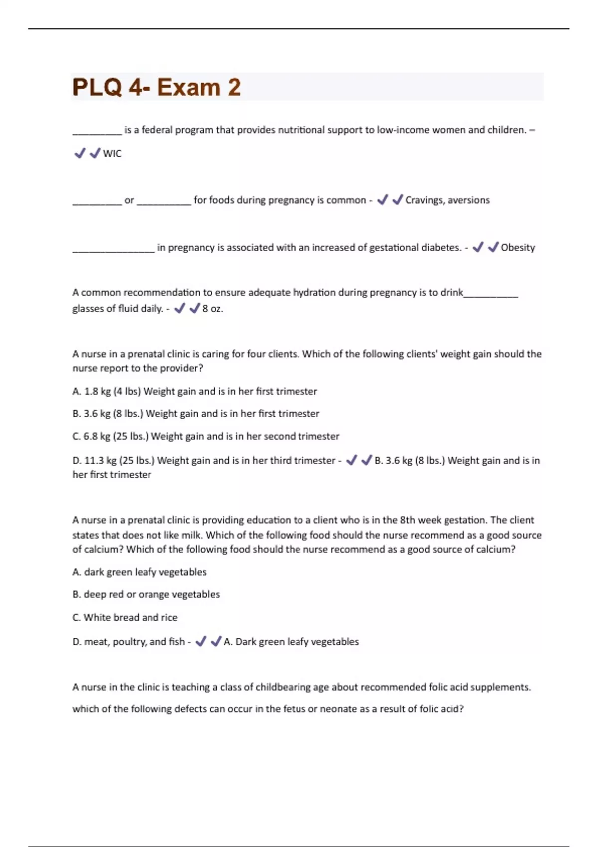_________ is a federal program that provides nutritional support to low-income women and children. – WIC _________ or __________ for foods during pregnancy is common - Cravings, aversions _______________ in pregnancy is associated with an increased of gestational diabetes. - Obesity A common recommendation to ensure adequate hydration during pregnancy is to drink__________ glasses of fluid daily. - 8 oz. A nurse in a prenatal clinic is caring for four clients. Which of the following clients' weight gain should the nurse report to the provider? A. 1.8 kg (4 lbs) Weight gain and is in her first trimester B. 3.6 kg (8 lbs.) Weight gain and is in her first trimester C. 6.8 kg (25 lbs.) Weight gain and is in her second trimester D. 11.3 kg (25 lbs.) Weight gain and is in her third trimester - B. 3.6 kg (8 lbs.) Weight gain and is in her first trimester A nurse in a prenatal clinic is providing education to a client who is in the 8th week gestation. The client states that does not like milk. Which of the following food should the nurse recommend as a good source of calcium? Which of the following food should the nurse recommend as a good source of calcium? A. dark green leafy vegetables B. deep red or orange vegetables C. White bread and rice D. meat, poultry, and fish - A. Dark green leafy vegetables A nurse in the clinic is teaching a class of childbearing age about recommended folic acid supplements. which of the following defects can occur in the fetus or neonate as a result of folic acid?A. iron deficiency anemia B. Poor bone formation C. Marcosomic fetus D. Neuro tube defects - D. Neuro tube defects A nurse is reviewing a new prescription for iron supplements with a client who is in the 8th week of gestation and has iron deficiency anemia. Which of the following beverages should the nurse instruct the client to take the iron supplements with? A. ice water B. low-fat or whole milk C. tea or coffee D. orange juice - D. orange juice A nurse is reviewing postpartum neutron needs with a group of new mothers who are breastfeeding their newborns. Which of the following statements by a member of the group indicates an understanding of the teaching? A. "I am glad I can have my morning coffee." B. "I should take folic acid to increase my milk supply." C. "I will consume adding 330 calories per day to my diet." D. "I will continue my calcium supplements because I don't like milk." - D. "I will continue my calcium supplements because I don't like milk." Prenatal vitamins are not necessary if the woman eats a balanced and healthy diet. - False Protein is found in large quantities in meat. How many meat servings per day are recommended for women during pregnancy? A. 1 B. 3 C. 6 D. 8 - C. 6Rationale: Meat is a prime source of protein, which is necessary for fetal growth, so six servings are recommended daily. The average recommended daily allows or total caloric intake during pregnancy ___________ calories daily. - 2200 True or False: A healthy nutrition plan before pregnancy should adequate folic acid. - False True or False: As a rule, the average woman should gain 11.3 to 15.8 (25 to 35 lbs.) during pregnancy. - True True or False: To ensure adjure fetal nutrition, women should not diet during pregnancy. - True True or False: Women should obtain their carbohydrate calories from complex carbohydrates rather than simple carbohydrates. - True What calorie intake is recommended during pregnancy? A. An additional 300 calories per day B. An average of 1,500 calories, except for obese patients C. An increase of 30 g of protein per day above the normal 44 to 46 g D. Individualization by multiplying 60 calories per kg of ideal body weight, then subtracting 300 calories - A. An additional 300 calories per day Rationale: An additional 300 calories per day will provide for healthy fetal growth. Why might fat-soluble vitamins be harmful if taken in large quantities during pregnancy? A.They can be stored in the body, leading to toxic effects. B.A low hemoglobin may develop. C.They are not absorbed from the gastrointestinal tract.D.They may render an oral contraceptive ineffective. - A. They can be stored in the body, leading to toxic effects. Rationale: Excessive fat-soluble vitamins are stored by the body and can accumulate into toxic amounts.