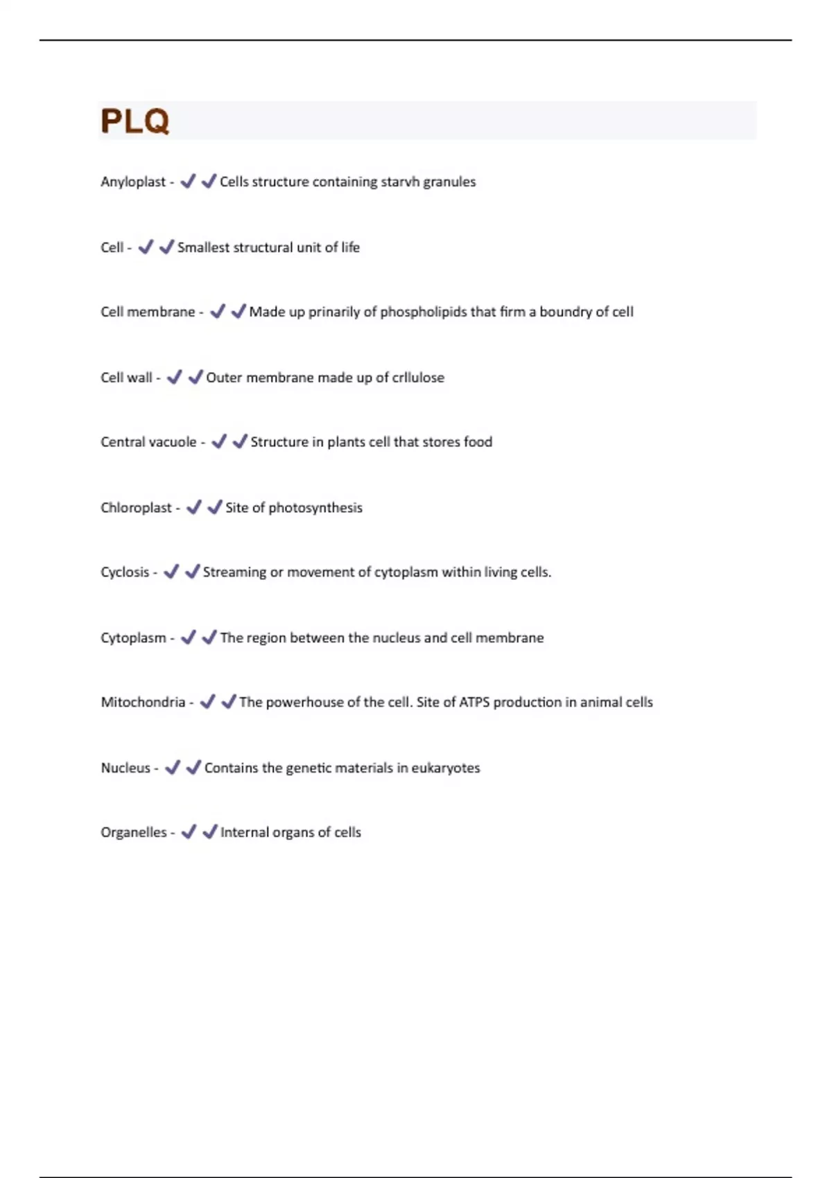 Anyloplast - Cells structure containing starvh granules Cell - Smallest structural unit of life Cell membrane - Made up prinarily of phospholipids that firm a boundry of cell Cell wall - Outer membrane made up of crllulose Central vacuole - Structure in plants cell that stores food Chloroplast - Site of photosynthesis Cyclosis - Streaming or movement of cytoplasm within living cells. Cytoplasm - The region between the nucleus and cell membrane Mitochondria - The powerhouse of the cell. Site of ATPS production in animal cells Nucleus - Contains the genetic materials in eukaryotes Organelles - Internal organs of cells