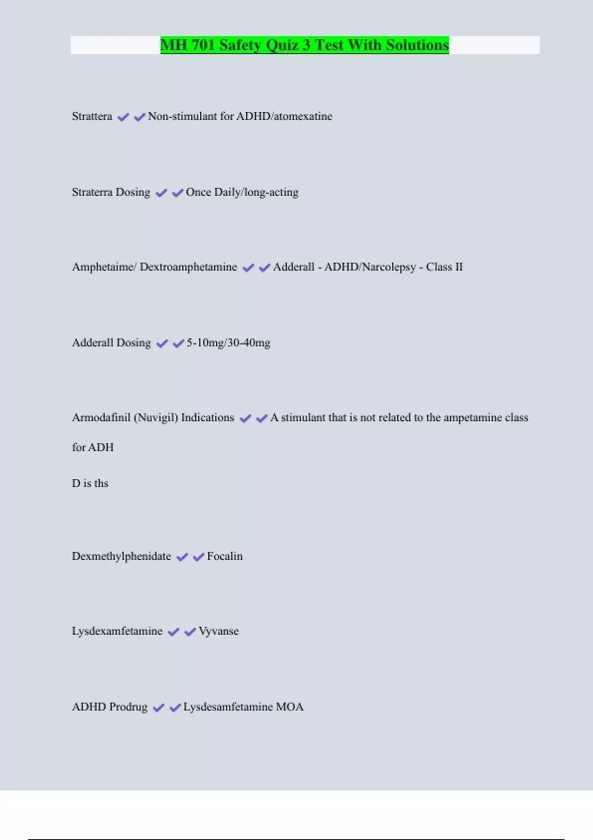MH 701 Safety Quiz 3 Test With Solutions Strattera Non-stimulant for ADHD/atomexatine Straterra Dosing Once Daily/long-acting Amphetaime/ Dextroamphetamine Adderall - ADHD/Narcolepsy - Class II Adderall Dosing 5-10mg/30-40mg Armodafinil (Nuvigil) Indications A stimulant that is not related to the ampetamine class for ADH D is ths Dexmethylphenidate Focalin Lysdexamfetamine Vyvanse