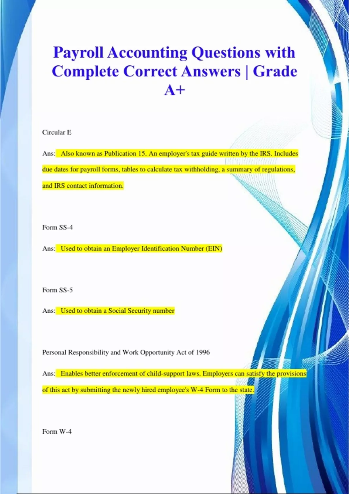 Circular E Ans: Also known as Publication 15. An employer's tax guide written by the IRS. Includes due dates for payroll forms, tables to calculate tax withholding, a summary of regulations, and IRS contact information. Form SS-4 Ans: Used to obtain an Employer Identification Number (EIN) Form SS-5 Ans: Used to obtain a Social Security number Personal Responsibility and Work Opportunity Act of 1996 Ans: Enables better enforcement of child-support laws. Employers can satisfy the provisions of this act by submitting the newly hired employee's W-4 Form to the state. Form W-4 Ans: Indicates the number of tax allowances being claimed. This provides the employer with information necessary to calculate both federal income tax withholding and applicable state income tax withholding. Immigration Reform and Control Act of 1986 Ans: Intended to reduce illegal employment of foreign workers in the U.S. Form I-9 Ans: Completed by the employee; acceptable documents are verified by the employer This document verifies that the employee is permitted to work in the United States. E-verify Ans: Compares information from employee with that possessed by various government agencies such as the Social Security Administration and the United States Department of Homeland Security. Employee Earnings Record Ans: Contains key employee and payroll information. Summarizes annual payroll figures. Facilitates completion of payroll tax forms. People employed by large businesses with revenues greater than $500,000, governmental agencies (local, state, or federal), hospitals, schools, and domestic workers and employees working for interstate commerce businesses must do what? Ans: pay the minimum wage Which groups of people are exceptions to the federal minimum wage requirement? Ans: Workers with disabilities, full-time students, young workers, tipped employees, student learners. What are the pay restrictions for a full-time student when working for specific employers (colleges and universities, agriculture, and retail or service stores)? Ans: May be paid 85% of the current minimum wage rate, and are limited to a maximum of 8 hours/day, 20/hours/week while school is in session. What are the pay restrictions for a young worker (under 20 years old)? Ans: May be paid $4.25/hour for the first 90 days of employment, as long as they do not replace another employee. The pay then reverts to the federal minimum after 90 days or after the employee turns 20, whichever occurs first. What are the pay restrictions for a tipped employee? Ans: May be paid $2.13/hour, as long as their tips, when added to this amount, equal or exceed the federal minimum wage. They must receive at least $30 in tips per month. Any deficit will be made up by the employer.