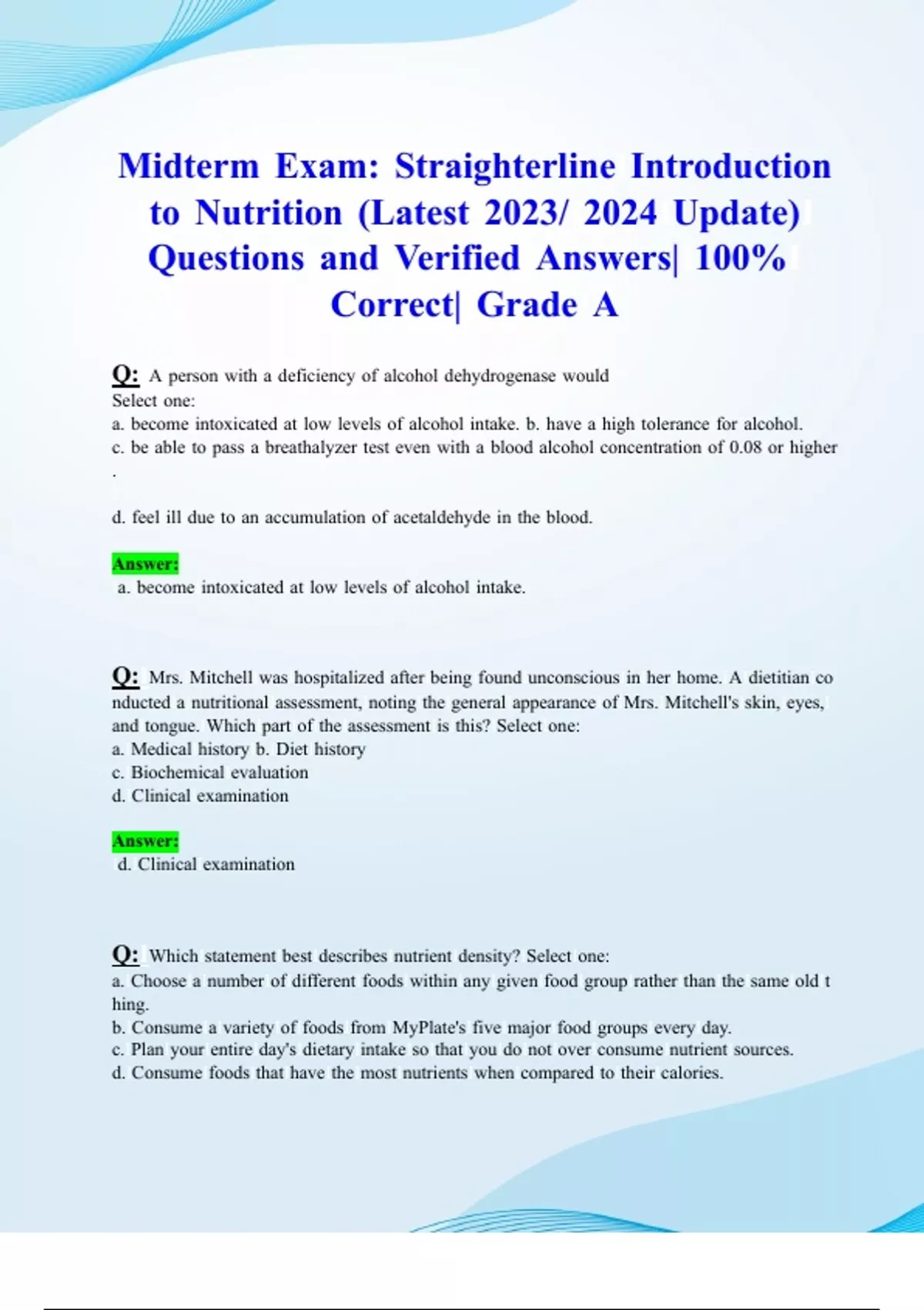 Midterm Exam: Straighterline Introduction to Nutrition (Latest 2024/ 2025 Update) Questions and Verified Answers| 100% Correct| Grade A Q: A person with a deficiency of alcohol dehydrogenase would Select one: a. become intoxicated at low levels of alcohol intake. b. have a high tolerance for alcohol. c. be able to pass a breathalyzer test even with a blood alcohol concentration of 0.08 or higher. d. feel ill due to an accumulation of acetaldehyde in the blood. Answer: a. become intoxicated at low levels of alcohol intake. Q: Mrs. Mitchell was hospitalized after being found unconscious in her home. A dietitian conducted a nutritional assessment, noting the general appearance of Mrs. Mitchell's skin, eyes, and tongue. Which part of the assessment is this? Select one: a. Medical history b. Diet history c. Biochemical evaluation d. Clinical examination Answer: d. Clinical examination Q: Which statement best describes nutrient density? Select one: a. Choose a number of different foods within any given food group rather than the same old thing. b. Consume a variety of foods from MyPlate's five major food groups every day. c. Plan your entire day's dietary intake so that you do not over consume nutrient sources. d. Consume foods that have the most nutrients when compared to their calories. Answer: d. Consume foods that have the most nutrients when compared to their calories. Q: The RDAs for nutrients generally are Select one: a. the minimum amounts the average adult male requires. b. more than twice the actual requirements. c. designed to prevent deficiency disease in half the population. d. designed to be adequate for almost all healthy people. Answer: d. designed to be adequate for almost all healthy people. Q: According to MyPlate, eggs belong in the group. Select one: a. protein b. dairy c. grain d. vegetable Answer: a. protein Q: The number of servings to consume from each MyPlate food group de- pends primarily on a person's Select one: a. weight, sleep patterns, and waist circumference. b. culture and taste preferences. c. age, sex, height, and weight d. frame size. Answer: c. age, sex, height, and weight Q: A comparison of the calorie content of a food to the weight of that food is Select one: a. energy density. b. nutrient density. c. body density. d. diet quality.