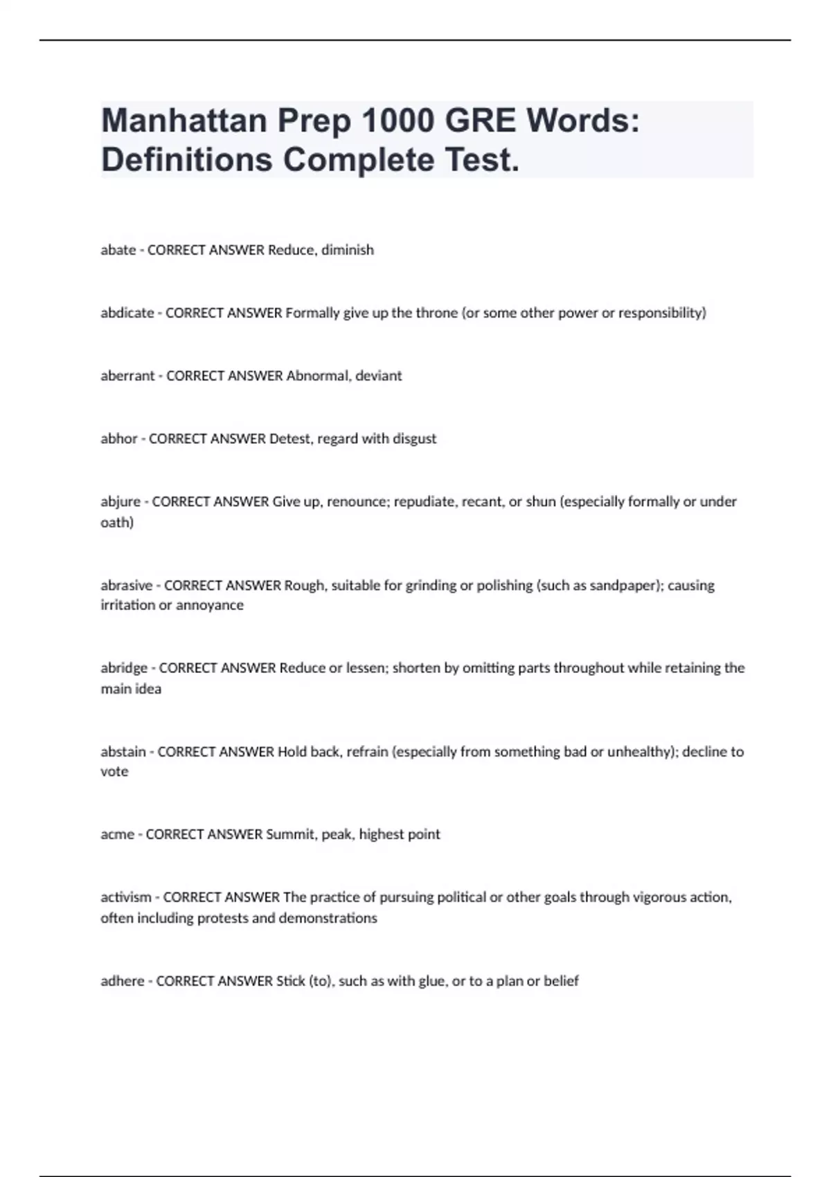 Manhattan Prep 1000 GRE Words: Definitions Complete Test. abate - CORRECT ANSWER Reduce, diminish abdicate - CORRECT ANSWER Formally give up the throne (or some other power or responsibility) aberrant - CORRECT ANSWER Abnormal, deviant abhor - CORRECT ANSWER Detest, regard with disgust abjure - CORRECT ANSWER Give up, renounce; repudiate, recant, or shun (especially formally or under oath) abrasive - CORRECT ANSWER Rough, suitable for grinding or polishing (such as sandpaper); causing irritation or annoyance abridge - CORRECT ANSWER Reduce or lessen; shorten by omitting parts throughout while retaining the main idea abstain - CORRECT ANSWER Hold back, refrain (especially from something bad or unhealthy); decline to vote acme - CORRECT ANSWER Summit, peak, highest point activism - CORRECT ANSWER The practice of pursuing political or other goals through vigorous action, often including protests and demonstrations adhere - CORRECT ANSWER Stick (to), such as with glue, or to a plan or belief admonish - CORRECT ANSWER Mildly scold; caution, advise, or remind to do something adverse - CORRECT ANSWER Opposing, harmful advocate - CORRECT ANSWER Speak or argue in favor of (verb); a person who pleads for a cause or on behalf of another person (noun) aesthetic - CORRECT ANSWER Concerning the appreciation of beauty or good taste, pertaining to the science of what is beautiful (adj); a sense of beauty and taste of a particular time and place (noun) affable - CORRECT ANSWER Warm and friendly, pleasant, approachable affectation - CORRECT ANSWER Fake behavior (such as in speech or dress) adopted to give a certain impression aggrandize - CORRECT ANSWER Make greater; exaggerate aggregate - CORRECT ANSWER Gather together, amount to (verb); constituting a whole made up of constituent parts (adj) alacrity - CORRECT ANSWER Cheerful or speedy willingness alienate - CORRECT ANSWER Cause to become unfriendly, hostile, or distant alleviate - CORRECT ANSWER Lessen, make easier to endure ambiguous - CORRECT ANSWER Not clear, hard to understand, open to having several meanings or interpretations