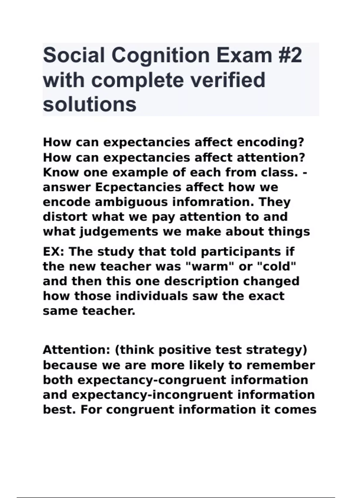 How can expectancies affect encoding? How can expectancies affect attention? Know one example of each from class. Ecpectancies affect how we encode ambiguous infomration. They distort what we pay attention to and what judgements we make about things EX: The study that told participants if the new teacher was "warm" or "cold" and then this one description changed how those individuals saw the exact same teacher. Attention: (think positive test strategy) because we are more likely to remember both expectancy-congruent information and expectancy-incongruent information best. For congruent information it comes down to the fact that we remember things that fit what we are looking for (this follows positive test strategy) and the fact that this information fits better with our existing schemas. For incongruent information it is because events are unexpected may be more memorable. EX: Hannah is a little girl that either has a low or high SES and how people expect her to perform on tasks How can goals affect encoding? When you goal is to remember an overall impression of someone you can remember more than if you focus on the little details (think of the blink face thing) How can event significance affect encoding? What has research demonstrated about flashbulb memories? The more significant an event the more likely we are to remember it because we encode the event differently Flashbulb: Is a memory that happens when you where in a heightened emotional state with vivid details (9/11, etc) Research shows there is no correlation between acuracy and confidence. When Ps were asked where they were during 9/11 then two weeks later 50% got the entire memory wrong (because we fill in the blanks of our memories using schemas - I probably would have done this...) How can expectancies affect retrieval? What is the misinformation effect and what is an experimental demonstration of this effect? Expectancies can make us add details that were not true to our memories because of the schemas we have surrounding the other events or sircumstances. Misinformation effect: Is a memory distortion where existing memories are altered by misleading (incorrect) information that is introduced at the time they are being retrieved. Experiment: Loftus and Palmer (1974) Ps showed a video of a car accident (fender bender type of thing). They are asked to estimate how fast the cars where going when they... • IV: Smashed into each other? Hit each other? DV: Ps estimated the speed the car was going. R: When the word was more violent (like smashed) - Ps average speed was much greater. Smashed - 41mph vs hit 34mph - One week later Ps asked whether or not there was broken glass in the video. 15% of those in the "smashed" condition answered yes, but only 5% answered yes in the "hit"/control conditions How can implicit theories affect retrieval? What are the two implicit theories we discussed in class? Retrieval is after it has been incoded. It is the same as expectations. An simplicity theory will cause us to retrieve information in a way that is consistent Writing ability with a stability theory makes you think that you aren't improving - you retrieve information in a way that conforms to what We assess current standing → consults implicit theory about relation between past and present → reconstruct past by integrating these 2 pieces of info Theories about stability and change Stability - we tend to think we are stable on many dimensions and so are others (see it as the same over time) i.e., how funny we are What is hindsight bias? Hindsight bias is the tendency to exaggerate the extent to which we could have predicted currently known outcomes. (when you learn about/know something now and you can't forget that you know it and you "see" the proof of it in you past memories.) EX: Now that you know John and Jane are dating you can look back and see all the times they were flirting with each other. How can goals influence retrieval? Information that fits with desired conclusion is more likely to be recalled; motivated to be consistent If Ps told extraversion leads to success, able to recall more extraverted events, and vice versa for introversion You think of all the times you matched that goal What does the Source Monitoring Framework suggest about memories? Memories are NOT stored with their source Having trouble distinguishing between 2 external sources, also between something that actually occurred vs. what you imagined You know it happen but don't know who said it or when. Or you aren't really sure it happened at all How can our memories influence source monitoring? If we imagine something, the more real it feels and more often it seems like it occurs IV 1: Ps view pictures 2x, 5x, or 8x (told in advance) IV 2: Ps imagined pictures as well either 2x, 5x, or 8x Task isn't hard, but inviting brain to get confused about what Ps saw and imagined DV: estimate of how many times they ACTUALLY saw the pictures Results The more times they imagined or saw the picture, the more times they thought they had seen the picture Kinda why when waking up from a dream that feels really real where you had a fight with someone close with you, no matter how irrational it is, you can be super upset about it when you wake up What is a pseudomemory? How can memories be created in the lab? Describe a study that demonstrates this. Pseudomemories are false memories that, although fictional, are experienced as if they were real. Meories can be created in the lab through implantation (especially under hypnosis), by telling Ps about the memories' framework and saying that it comes from a trusted source, through showing Ps photoshopped photos, or by using unrelated pictures then telling Ps about false memories. Ps saw 4 photos: 3 were real and one was a fake photo of a hot air balloon ride (photoshopped) (a family member verified that the Ps had never been on a hot air ballon ride. After reviewing the photos 3 times over 2 weeks 50% of Ps remember details abou