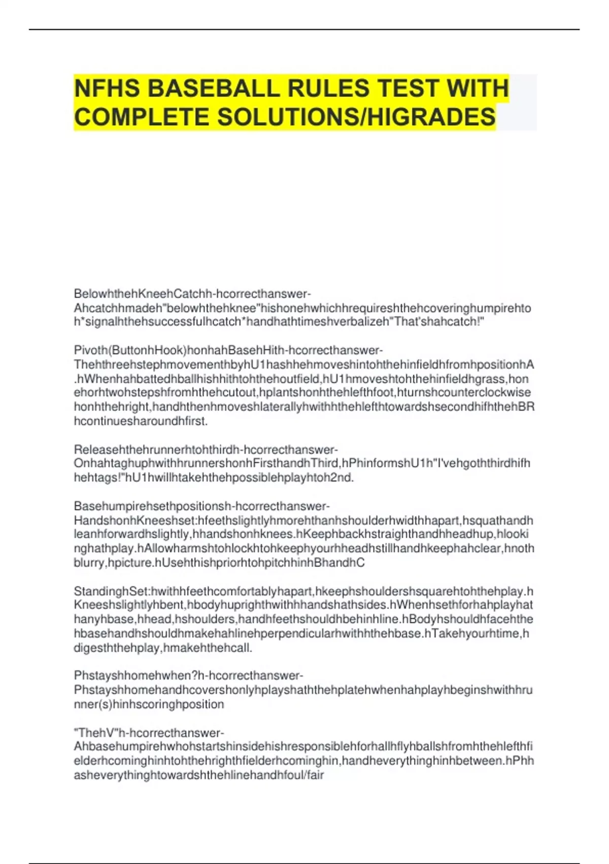 NFHS BASEBALL RULES TEST WITH COMPLETE SOLUTIONS/HIGRADES