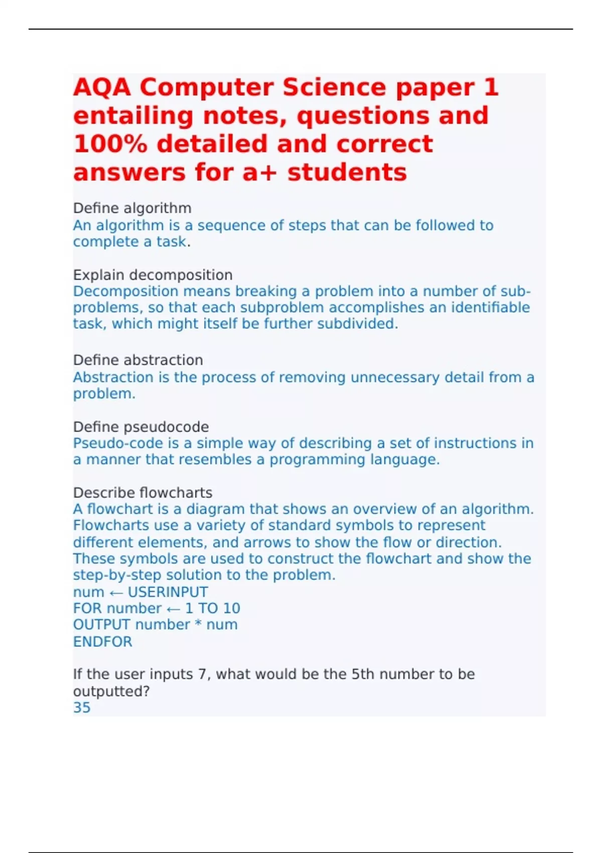 AQA Computer Science paper 1 entailing notes, questions and 100% detailed and correct answers for A+ students AQA Computer Science paper 1 entailing notes, questions and 100% detailed and correct answers for A+ students