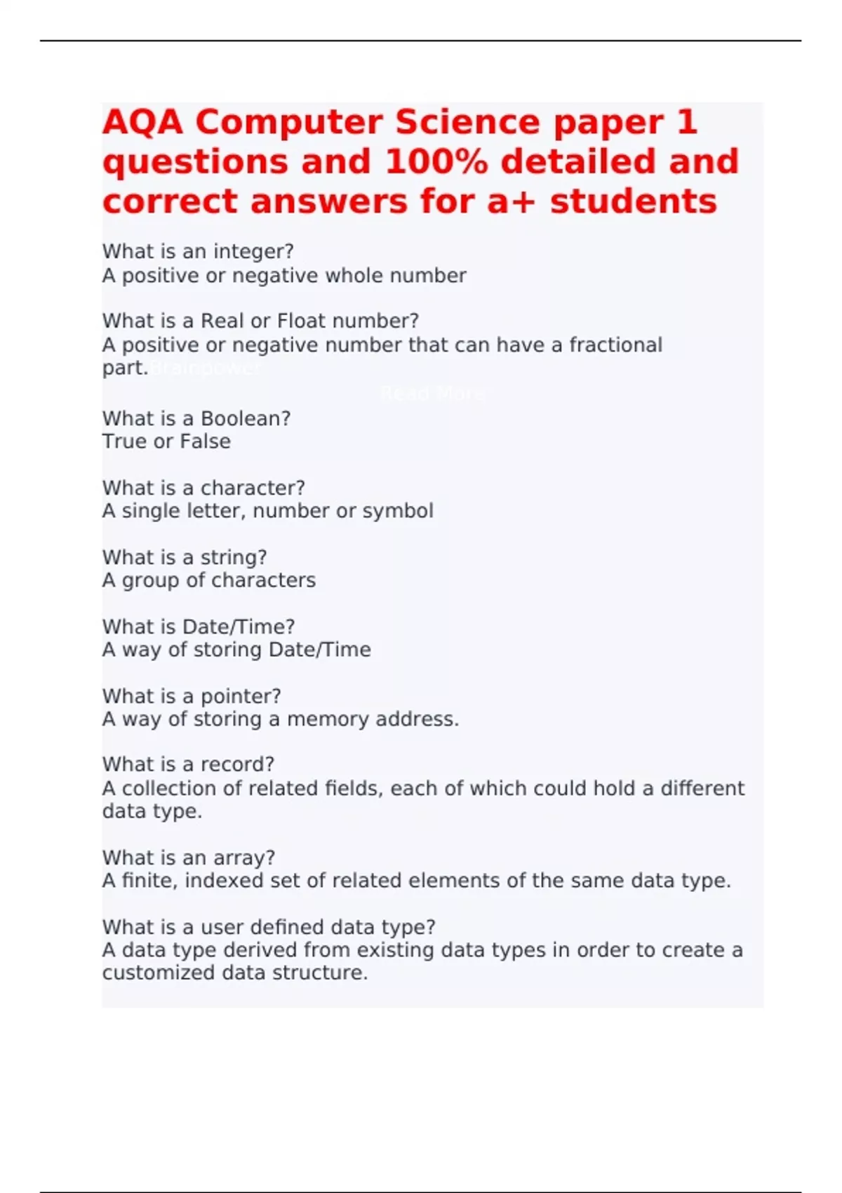 AQA Computer Science paper 1 questions and 100% detailed and correct answers for A+ students