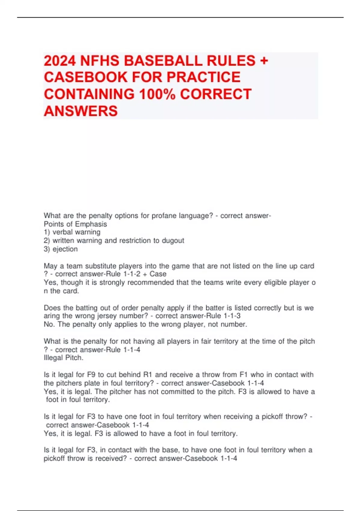 2024 NFHS BASEBALL RULES + CASEBOOK FOR PRACTICE CONTAINING 100% CORRECT ANSWERS
