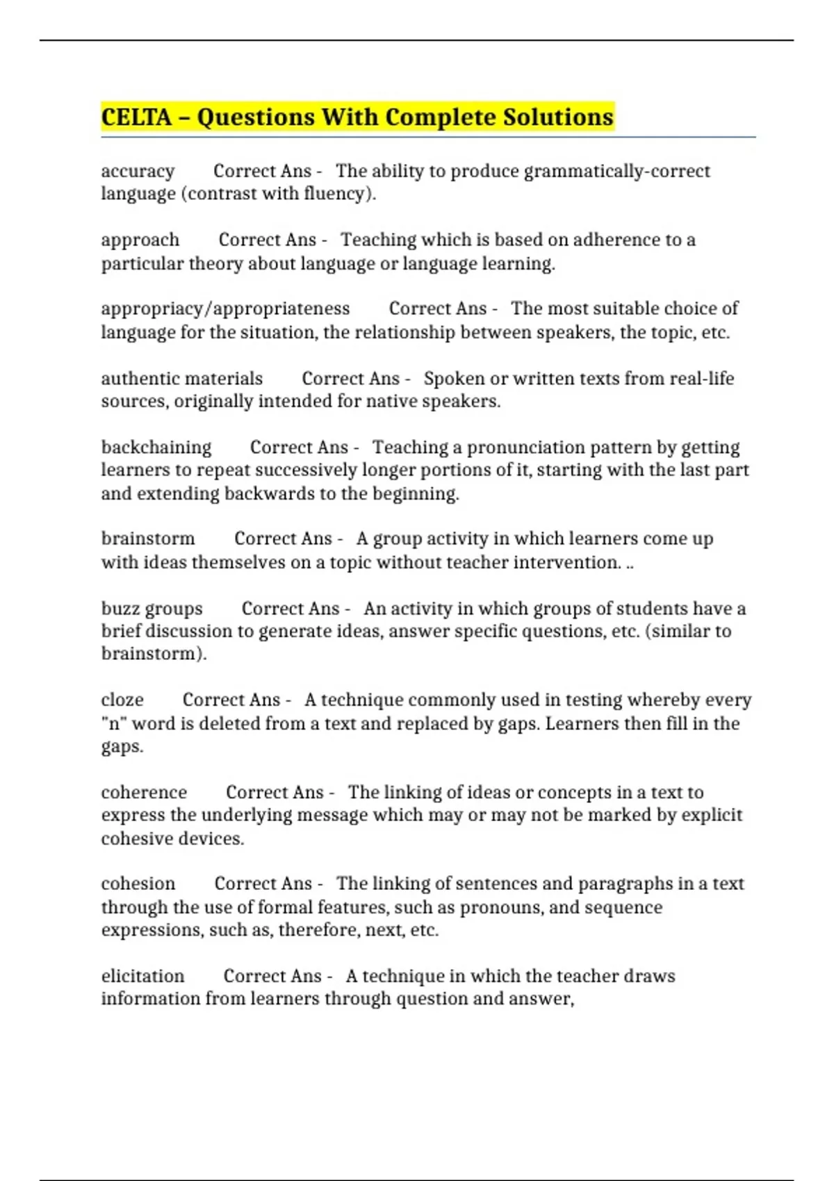 celta questions with complete solutions
