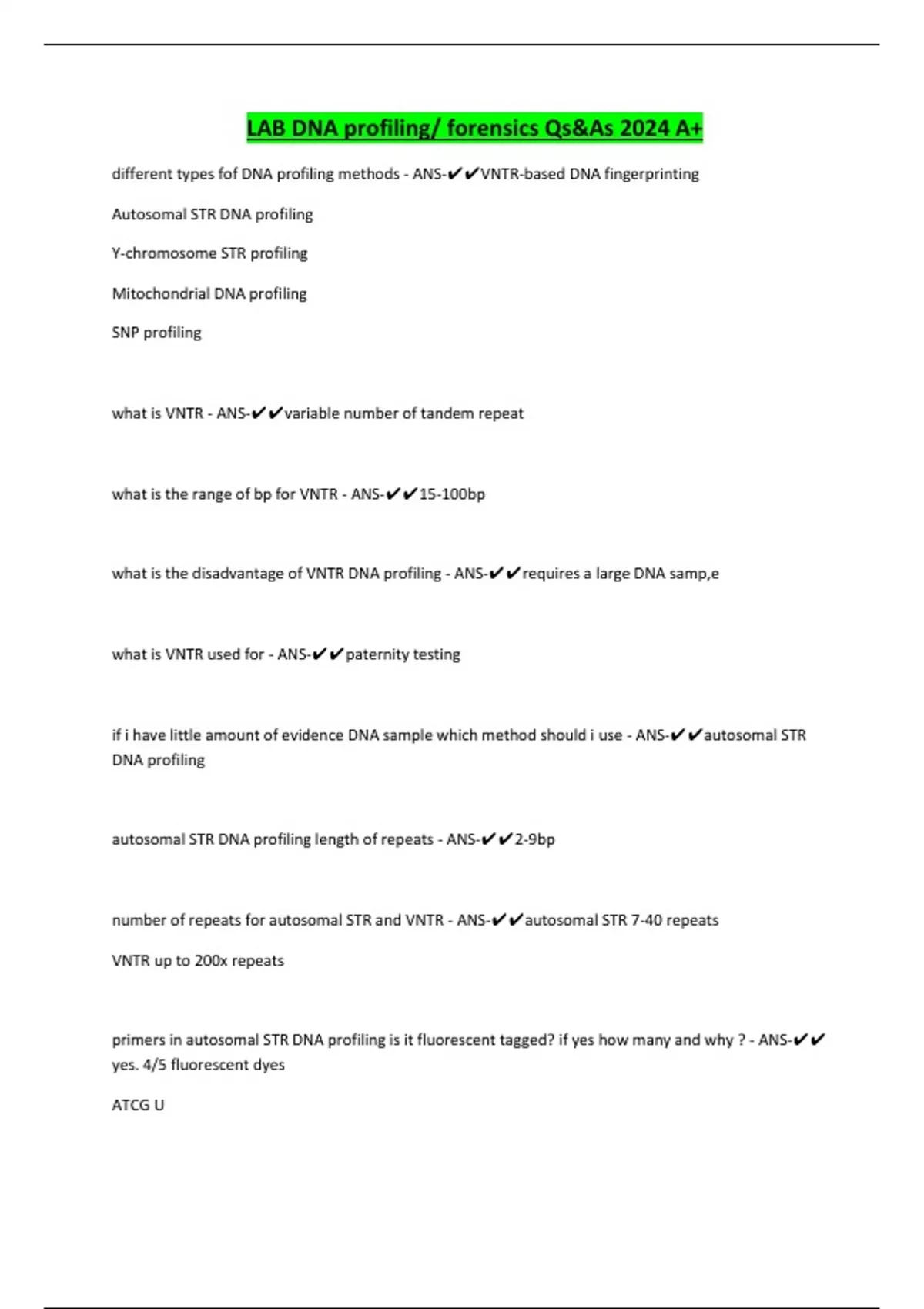 LAB DNA profiling/ forensics Qs&As 2024 A+ different types fof DNA profiling methods - ANS-VNTR-based DNA fingerprinting Autosomal STR DNA profiling Y-chromosome STR profiling Mitochondrial DNA profiling SNP profiling what is VNTR - ANS-variable number of tandem repeat what is the range of bp for VNTR - ANS-15-100bp what is the disadvantage of VNTR DNA profiling - ANS-requires a large DNA samp,e what is VNTR used for - ANS-paternity testing if i have little amount of evidence DNA sample which method should i use - ANS-autosomal STR DNA profiling autosomal STR DNA profiling length of repeats - ANS-2-9bp number of repeats for autosomal STR and VNTR - ANS-autosomal STR 7-40 repeats VNTR up to 200x repeats primers in autosomal STR DNA profiling is it fluorescent tagged? if yes how many and why ? - ANS...