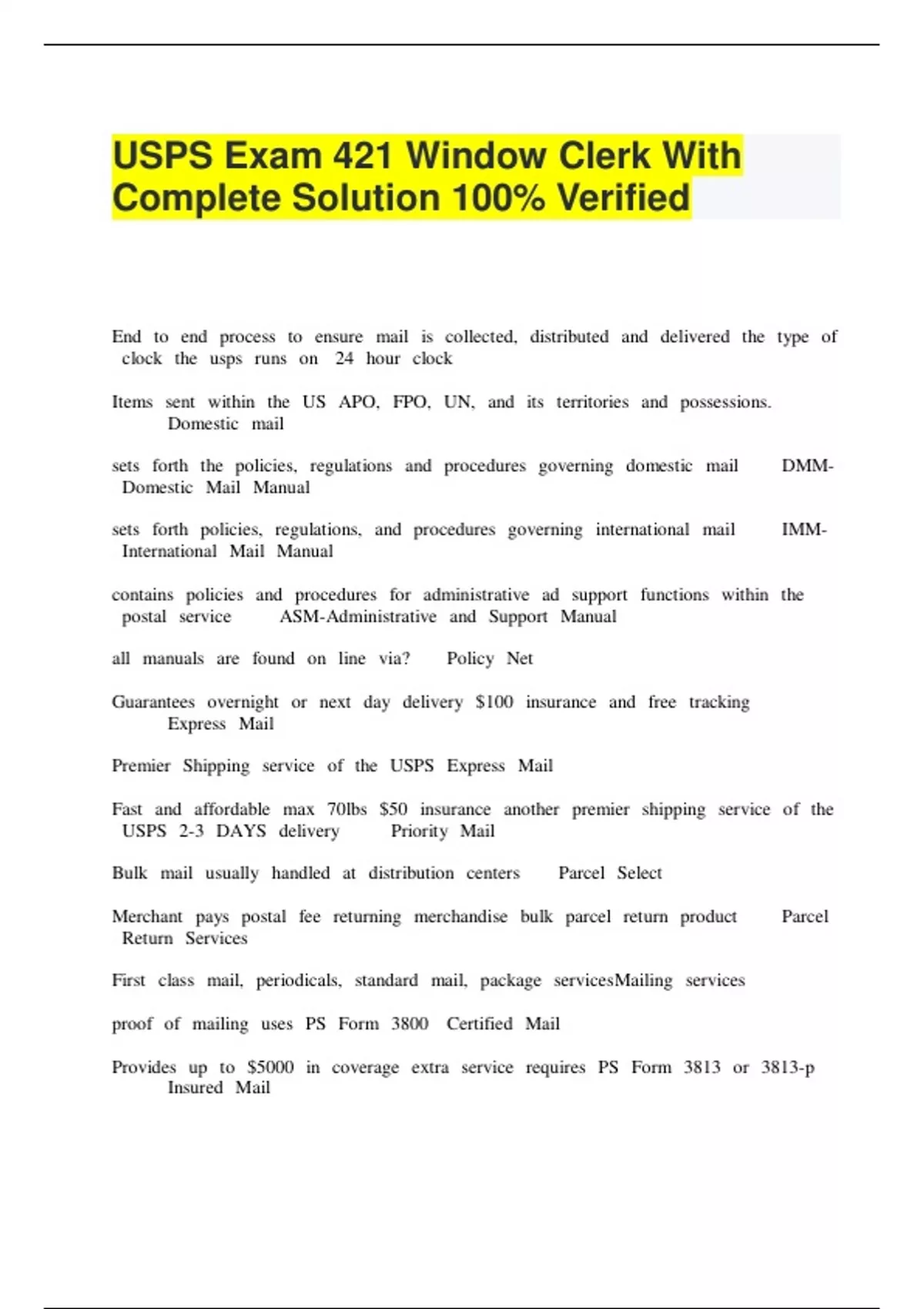 USPS Exam 421 Window Clerk With Complete Solution 100% Verified