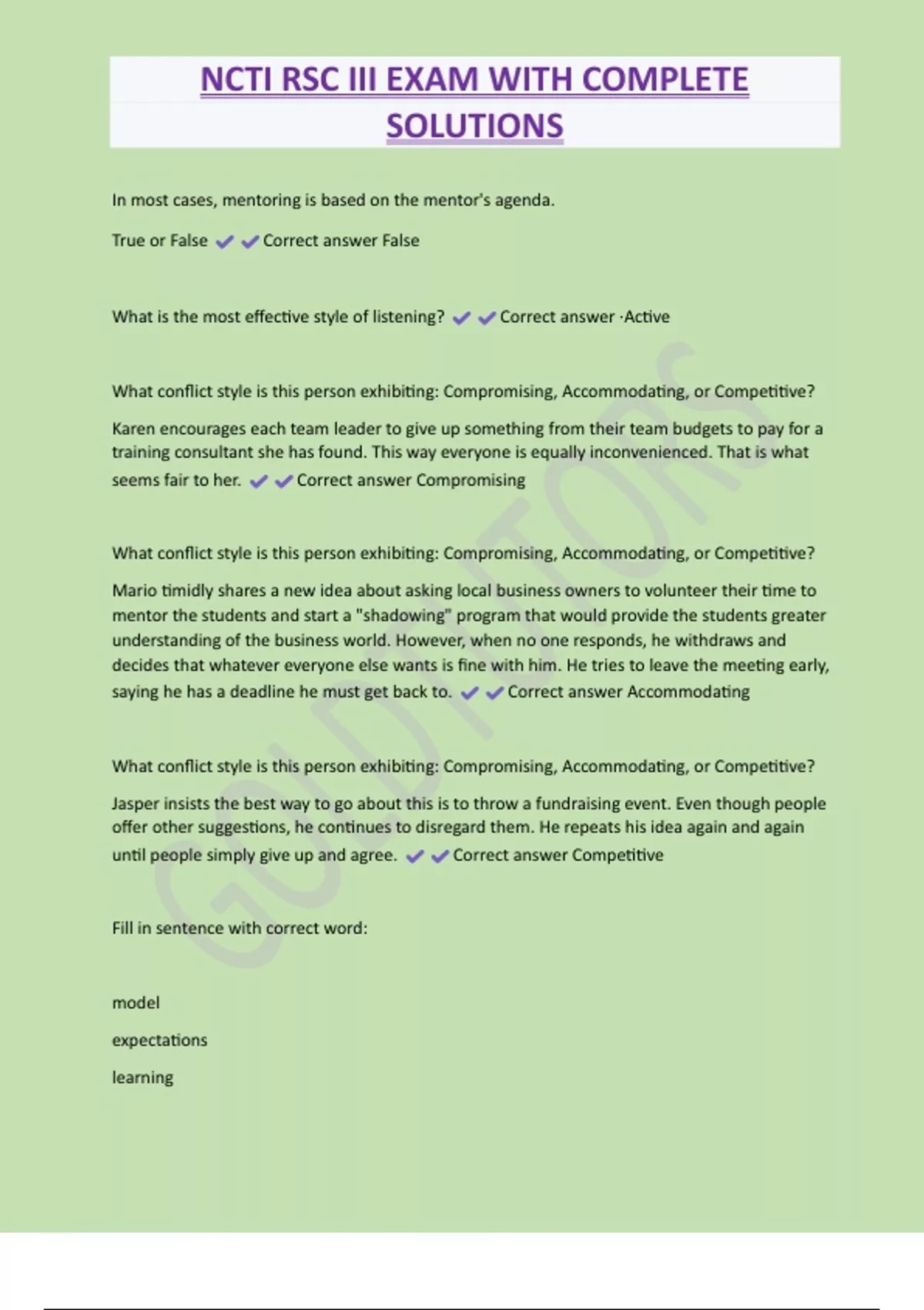 NCTI RSC III EXAM WITH COMPLETE SOLUTIONS In most cases, mentoring is based on the mentor's agenda. True or False Correct answer False What is the most effective style of listening? Correct answer ·Active What conflict style is this person exhibiting: Compromising, Accommodating, or Competitive? Karen encourages each team leader to give up something from their team budgets to pay for a training consultant she has found. This way everyone is equally inconvenienced. That is what seems fair to her. Correct answer Compromising