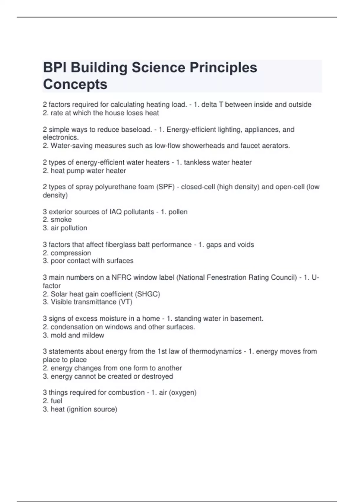 2 factors required for calculating heating load. - 1. delta T between inside and outside 2. rate at which the house loses heat 2 simple ways to reduce baseload. - 1. Energy-efficient lighting, appliances, and electronics. 2. Water-saving measures such as low-flow showerheads and faucet aerators. 2 types of energy-efficient water heaters - 1. tankless water heater 2. heat pump water heater 2 types of spray polyurethane foam (SPF) - closed-cell (high density) and open-cell (low density) 3 exterior sources of IAQ pollutants - 1. pollen 2. smoke 3. air pollution 3 factors that affect fiberglass batt performance - 1. gaps and voids 2. compression 3. poor contact with surfaces 3 main numbers on a NFRC window label (National Fenestration Rating Council) - 1. Ufactor 2. Solar heat gain coefficient (SHGC) 3. Visible transmittance (VT) 3 signs of excess moisture in a home - 1. standing water in basement. 2. condensation on windows and other surfaces. 3. mold and mildew 3 statements about energy from the 1st law of thermodynamics - 1. energy moves from place to place 2. energy changes from one form to another 3. energy cannot be created or destroyed 3 things required for combustion - 1. air (oxygen) 2. fuel 3. heat (ignition source)