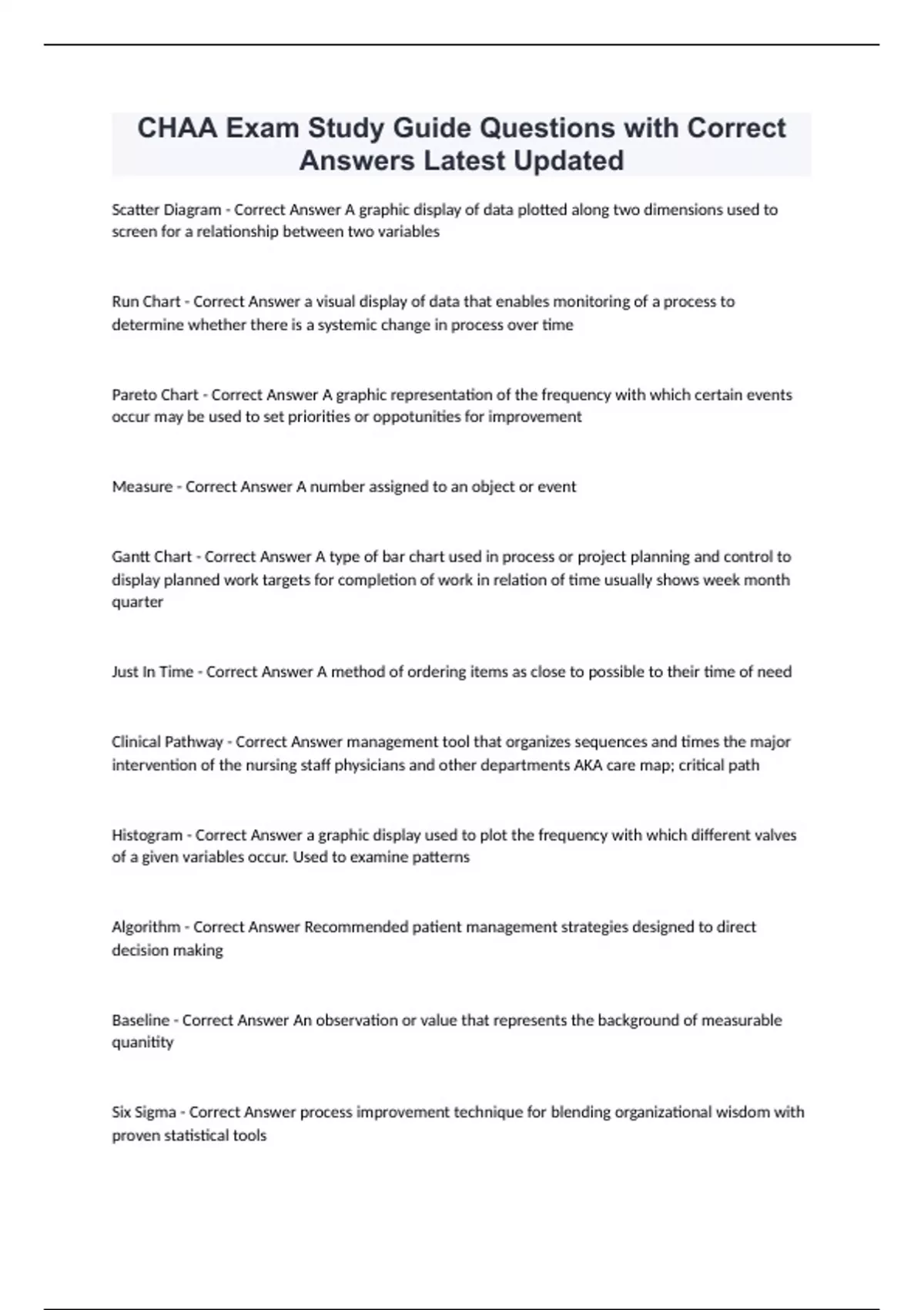 CHAA Exam Study Guide Questions with Correct Answers Latest Updated Scatter Diagram - Correct Answer A graphic display of data plotted along two dimensions used to screen for a relationship between two variables Run Chart - Correct Answer a visual display of data that enables monitoring of a process to determine whether there is a systemic change in process over time Pareto Chart - Correct Answer A graphic representation of the frequency with which certain events occur may be used to set priorities or oppotunities for improvement Measure - Correct Answer A number assigned to an object or event Gantt Chart - Correct Answer A type of bar chart used in process or project planning and control to display planned work targets for completion of work in relation of time usually shows week month quarter Just In Time - Correct Answer A method of ordering items as close to possible to their time of need Clinical Pathway - Correct Answer management tool that organizes sequences and times the major intervention of the nursing staff physicians and other departments AKA care map; critical path Histogram - Correct Answer a graphic display used to plot the frequency with which different valves of a given variables occur. Used to examine patterns Algorithm - Correct Answer Recommended patient management strategies designed to direct decision making Baseline - Correct Answer An observation or value that represents the background of measurable quanitity Six Sigma - Correct Answer process improvement technique for blending organizational wisdom with proven statistical tools