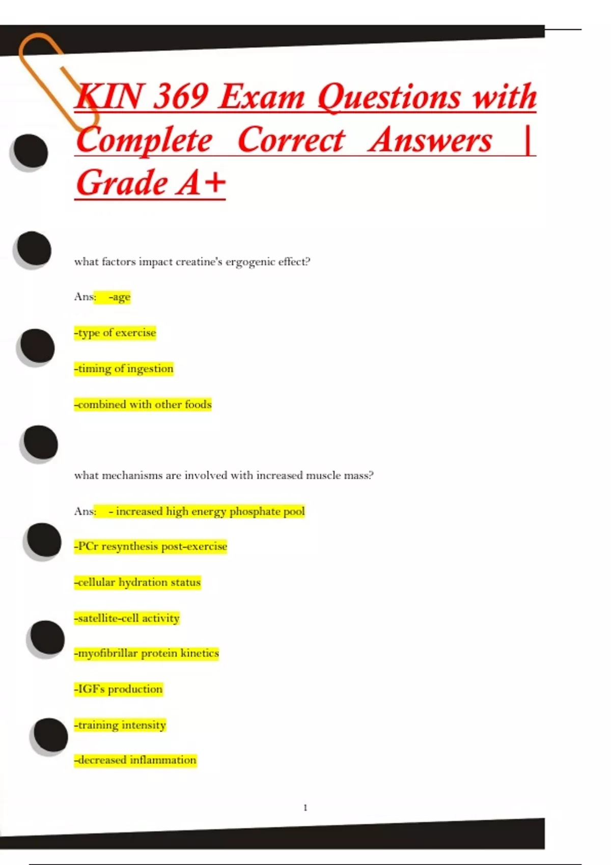 KIN 369 Exam Questions with Complete Correct Answers | Grade A+