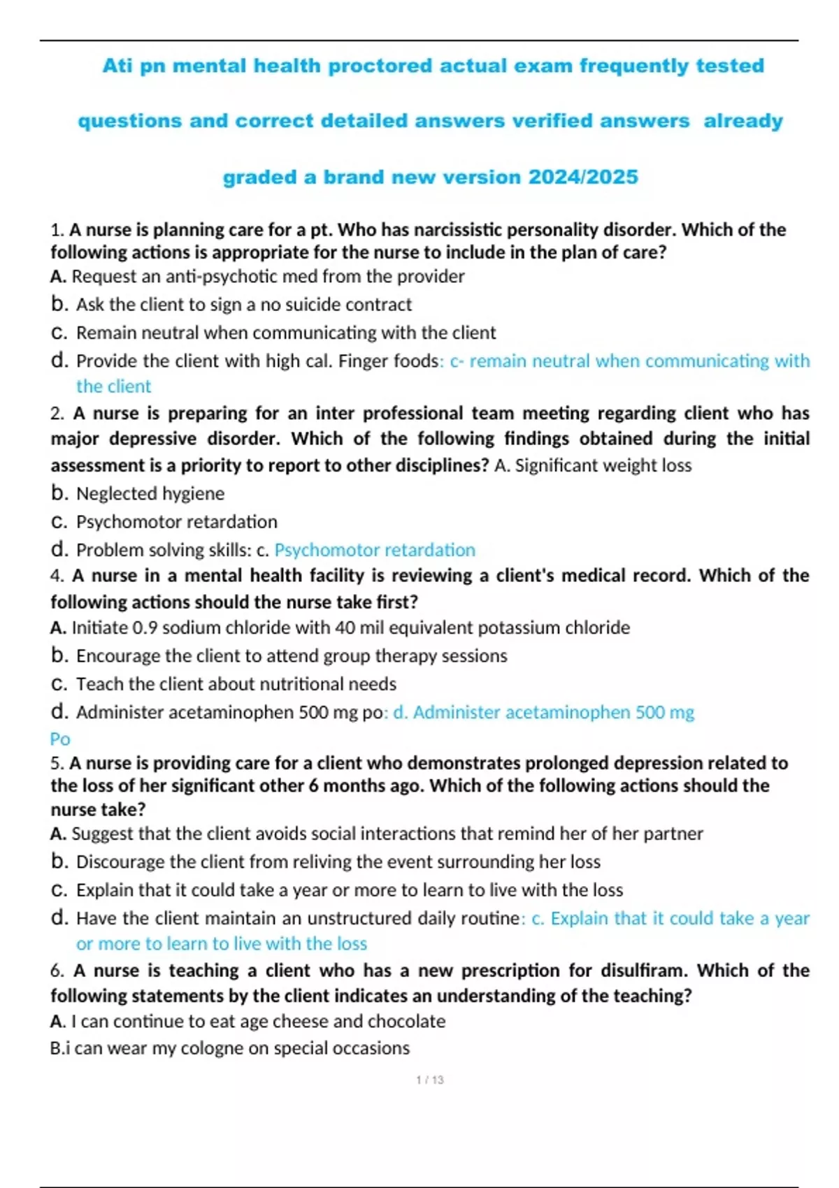 ATI PN MENTAL HEALTH PROCTORED ACTUAL EXAM 300 FREQUENTLY TESTED QUESTIONS AND CORRECT DETAILED ANSWERS VERIFIED ANSWERS ALREADY GRADED A BRAND NEW VERSION 2024