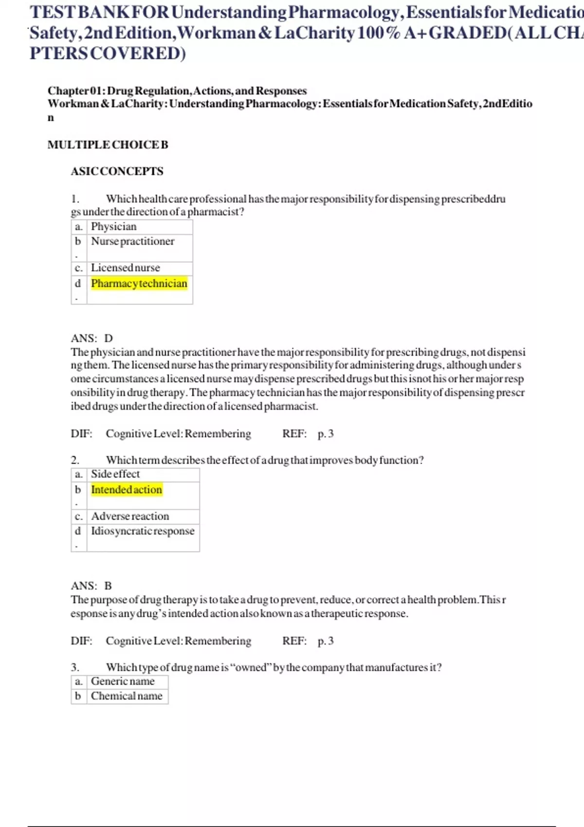 esponse iisiany idrug’s iintended iaction ialso iknown ias iaitherapeutic iresponse. DIF: Cognitive iLevel: iRememb ering REF: p.i3 3. Which itype iof idrug iname iisi―owned‖ iby ithe icompany ithat imanufactures iit? a. Generic iname b Chemical iname TEST iBANK iFOR iUnderstanding iPharmacology, iEssentials ifor iMedication i