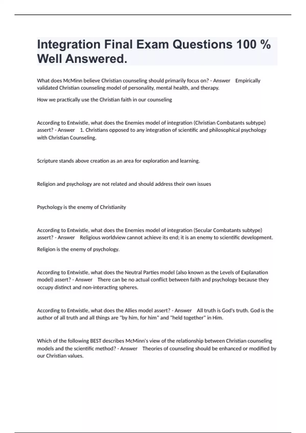What does McMinn believe Christian counseling should primarily focus on? - Answer Empirically validated Christian counseling model of personality, mental health, and therapy. How we practically use the Christian faith in our counseling According to Entwistle, what does the Enemies model of integration (Christian Combatants subtype) assert? - Answer 1. Christians opposed to any integration of scientific and philosophical psychology with Christian Counseling. Scripture stands above creation as an area for exploration and learning. Religion and psychology are not related and should address their own issues Psychology is the enemy of Christianity According to Entwistle, what does the Enemies model of integration (Secular Combatants subtype) assert? - Answer Religious worldview cannot achieve its end; it is an enemy to scientific development. Religion is the enemy of psychology. According to Entwistle, what does the Neutral Parties model (also known as the Levels of Explanation model) assert? - Answer There can be no actual conflict between faith and psychology because they occupy distinct and non-interacting spheres. According to Entwistle, what does the Allies model assert? - Answer All truth is God's truth. God is the author of all truth and all things are "by him, for him" and "held together" in Him. Which of the following BEST describes McMinn's view of the relationship between Christian counseling models and the scientific method? - Answer Theories of counseling should be enhanced or modified by our Christian values.