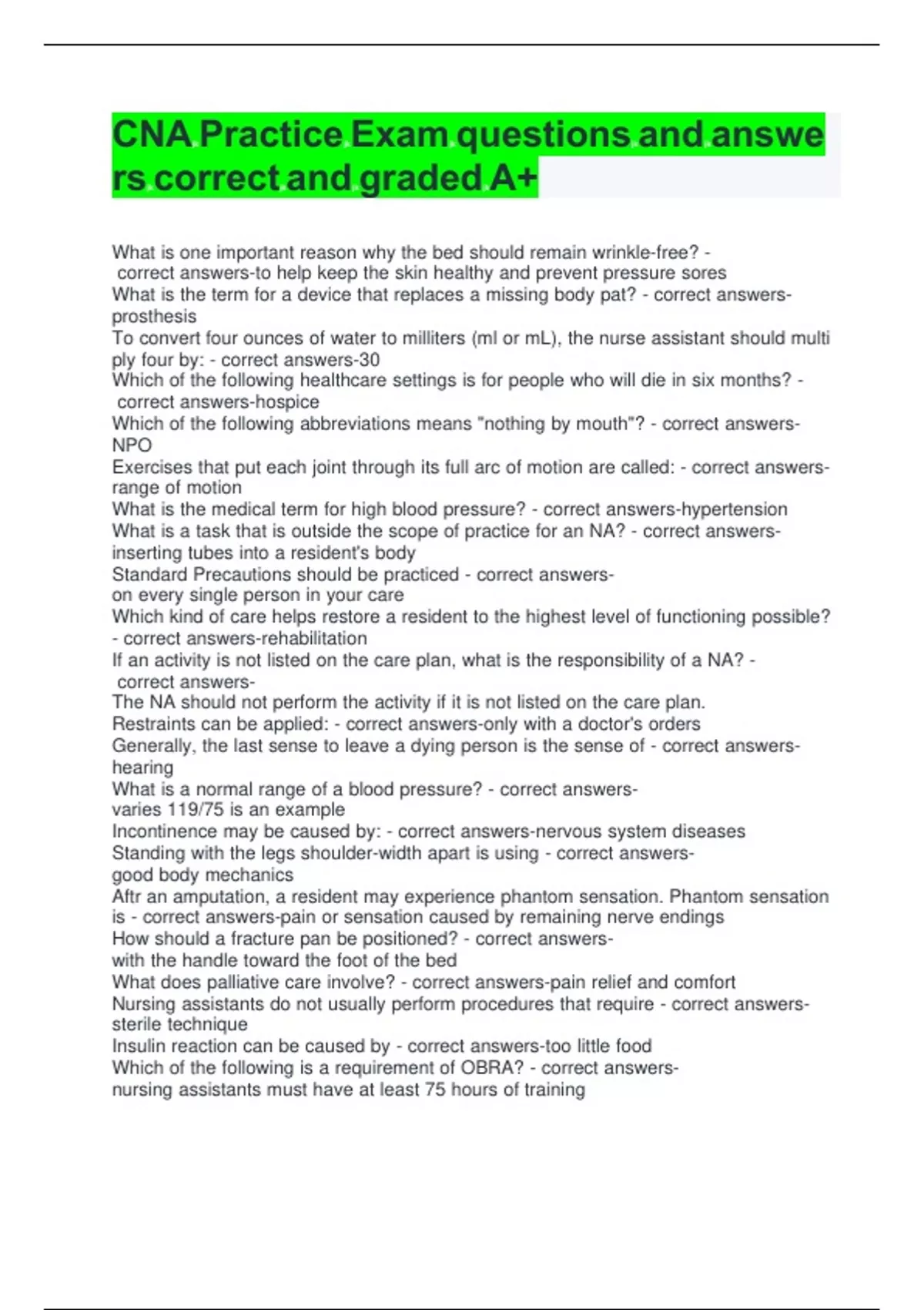 CNA Practice Exam questions and answers correct and graded A+ CNA Practice Exam questions and answers correct and graded A+ CNA Practice Exam questions and answers correct and graded A+ CNA Practice Exam questions and answers correct and graded A+