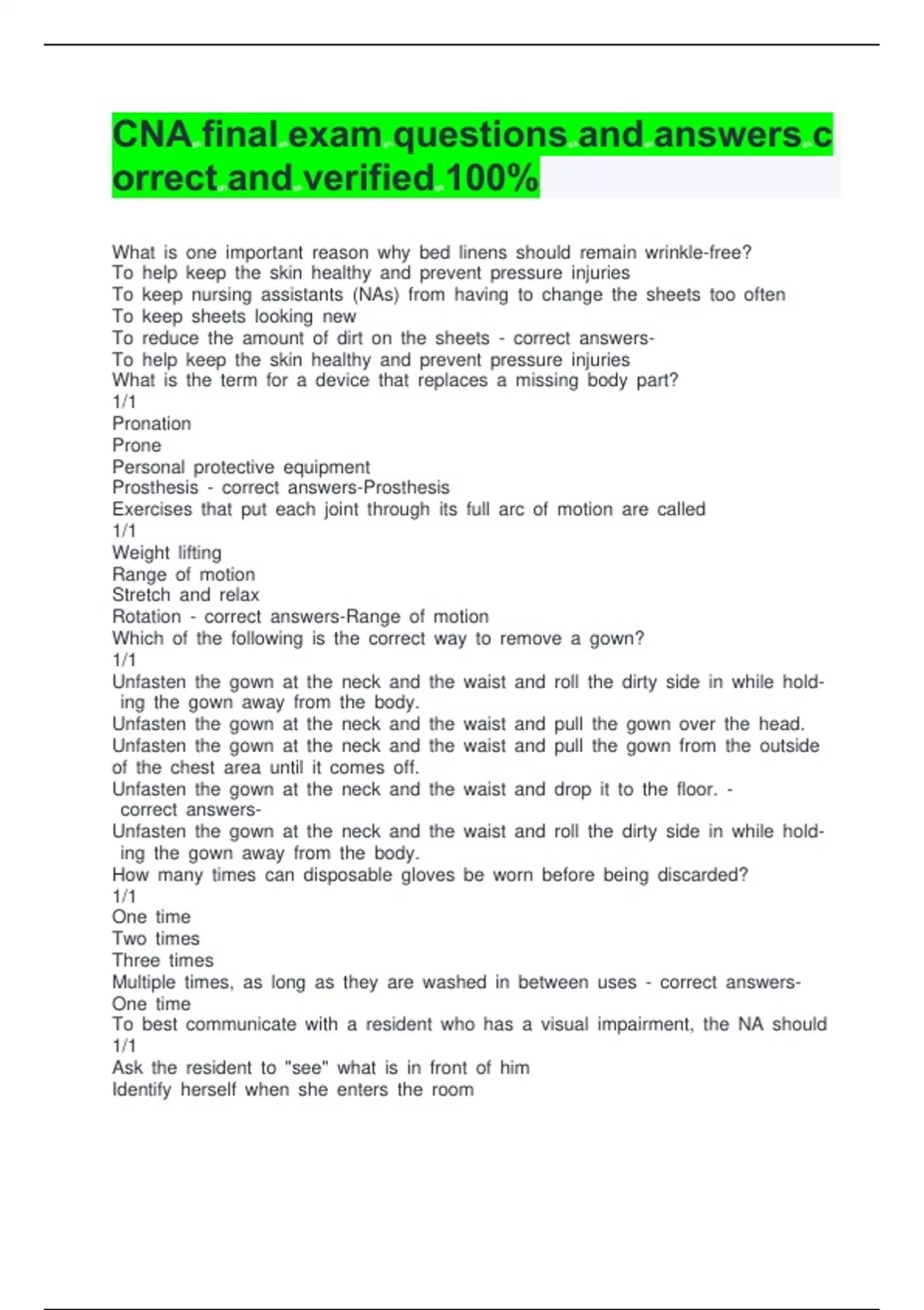 CNA final exam questions and answers correct and verified 100%CNA final exam questions and answers correct and verified 100%CNA final exam questions and answers correct and verified 100%CNA final exam questions and answers correct and verified 100%CNA final exam questions and answers correct and verified 100%