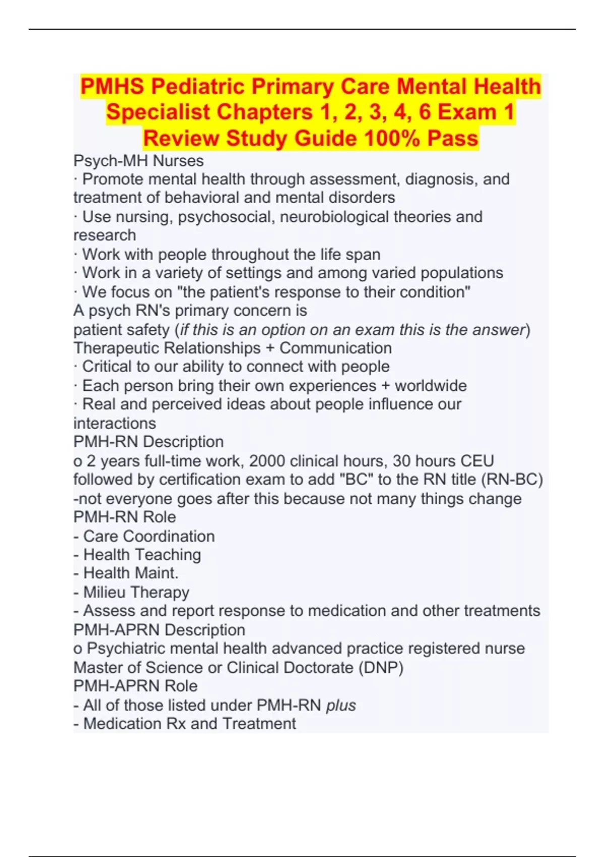 PMHS Pediatric Primary Care Mental Health Specialist Chapters 1, 2, 3, 4, 6 Exam 1 Review Study Guide 100% Pass