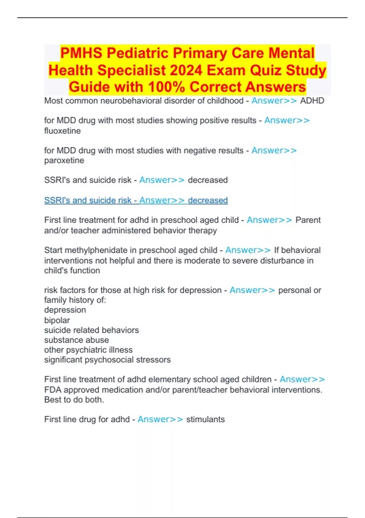PMHS Pediatric Primary Care Mental Health Specialist 2024 Exam Quiz Study Guide with 100% Correct Answers PMHS Pediatric Primary Care Mental Health Specialist 2024 Exam Quiz Study Guide with 100% Correct Answers