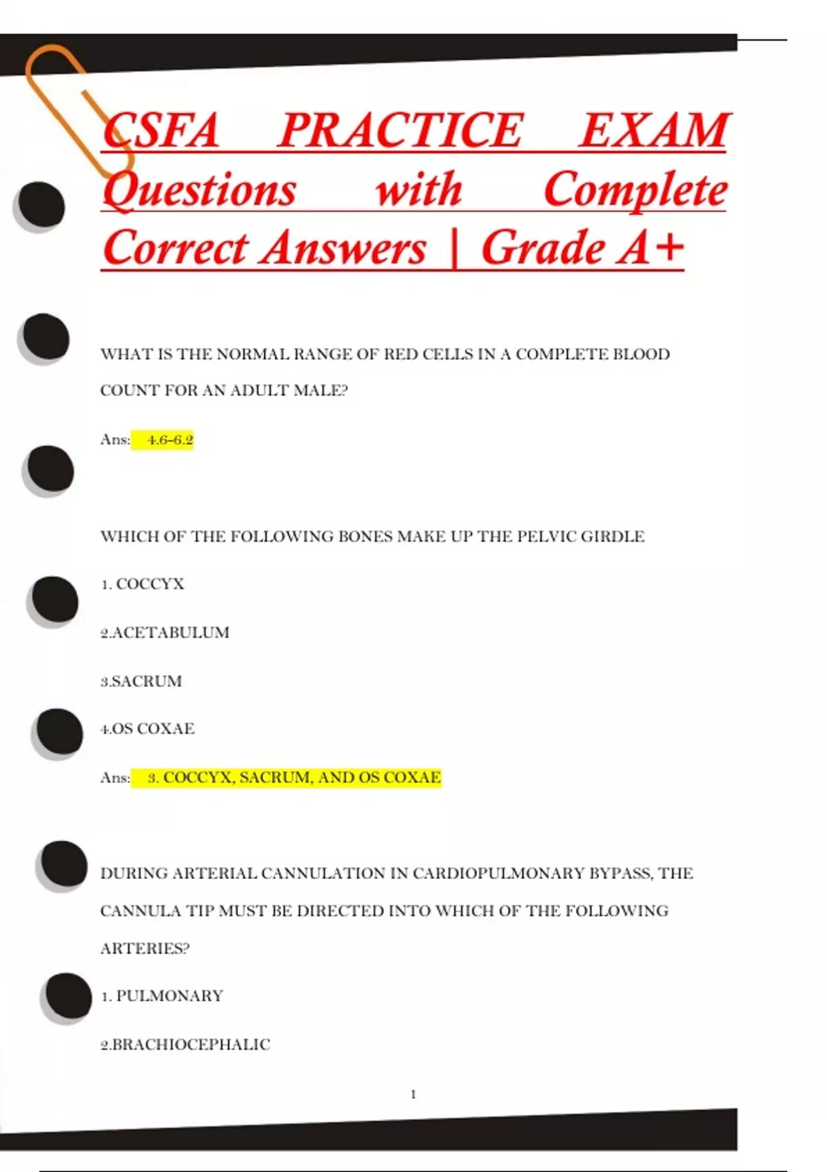 WHAT IS THE NORMAL RANGE OF RED CELLS IN A COMPLETE BLOOD COUNT FOR AN ADULT MALE? Ans: 4.6-6.2 WHICH OF THE FOLLOWING BONES MAKE UP THE PELVIC GIRDLE 1. COCCYX 2.ACETABULUM 3.SACRUM 4.OS COXAE Ans: 3. COCCYX, SACRUM, AND OS COXAE DURING ARTERIAL CANNULATION IN CARDIOPULMONARY BYPASS, THE CANNULA TIP MUST BE DIRECTED INTO WHICH OF THE FOLLOWING ARTERIES? 1. PULMONARY 2.BRACHIOCEPHALIC 2 3.AORTA 4.CORONARIES Ans: 3. AORTA WHICH OF THE FOLLOWING IS AN EXAMPLE OF A HIGH LEVEL DISINFECTING AGENT? 1. GLUTARALDEHYDE 2.ISOPROPYL ALCOHOL 3.QUATERNARY AMMONIUM 4.IODOPHOR SOLUTION Ans: 1.GLUTARALDEHYDE A LONG TERM COMPLICATION OF A CEMENTED TOTAL HIP IS? 1. ANTERIOR DISLOCATION 2.POSTERIOR DISLOCATION 3. LOOSENING OF THE PROSTHESIS 4.IMPINGEMENT OF THE SCIATIC NERVE Ans: 3. LOOSENING OF THE PROSTHESIS 3 DURING A POSTEROLATERAL APPROACH TO THE HIP, WHICH OF THE FOLLOWING STRUCTURES USUALLY FOUND SUPERFICIALLY TO THE OBTURATOR AND GEMELLI SHOULD BE IDENTIFIED AND PROTECTED? 1.SCIATIC NERVE 2.SUPERIOR GLUTEAL 3.INFERIOR GLUTEAL 4.LATERAL FEMORAL CUTANEOUS NERVE Ans: 1.SCIATIC NERVE TETRALOGY OF FALLOT INCLUDES WHICH OF THE FOLLOWING DEFECTS? 1.VENTRICULAR SEPTAL DEFECT 2.AORTIC STENOSIS 3.PULMONARY VALVE STENOSIS 4.RIGHT VENTRICULAR HYPERTROPHY Ans: 1.VENTRICULAR SEPTAL DEFECT 3.PULMONARY V