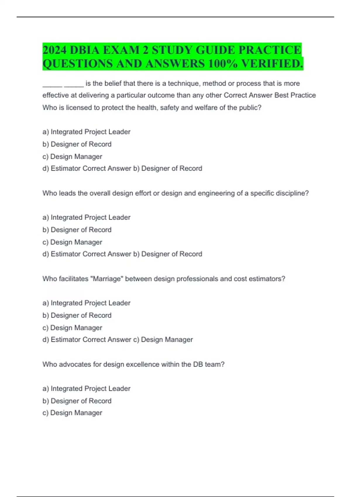 2024 DBIA EXAM 2 STUDY GUIDE PRACTICE QUESTIONS AND ANSWERS 100% VERIFIED. _____ _____ is the belief that there is a technique, method or process that is more effective at delivering a particular outcome than any other Correct Answer Best Practice Who is licensed to protect the health, safety and welfare of the public? a) Integrated Project Leader b) Designer of Record c) Design Manager d) Estimator Correct Answer b) Designer of Record Who leads the overall design effort or design and engineering of a specific discipline? a) Integrated Project Leader b) Designer of Record c) Design Manager d) Estimator Correct Answer b) Designer of Record Who facilitates "Marriage" between design professionals and cost estimators? a) Integrated Project Leader b) Designer of Record c) Design Manager d) Estimator Correct Answer c) Design Manager Who advocates for design excellence within the DB team? a) Integrated Project Leader b) Designer of Record c) Design Manager d) Estimator Correct Answer c) Design Manager Who manages design information flow & deliverables? a) Integrated Project Leader b) Designer of Record c) Design Manager d) Estimator Correct Answer c) Design Manager Who manages design performance interface? a) Integrated Project Leader b) Designer of Record c) Design Manager d) Estimator Correct Answer b) Designer of Record The Integrated Project Leader is a traditional hard-bid project manager. True or False? Correct Answer False Who has to perform their design services within a common "Standard of Care"? a) Integrated Project Leader b) Designer of Record c) Design Manager d) Estimator Correct Answer b) Designer of Record Who are considered to be "trained creative problem solvers"? a) Integrated Project Leader b) Designer of Record c) Design Manager d) Estimator Correct Answer b) Designer of Record Who sustains a collaborative environment among people with diverse roles, backgrounds, and opinions? a) Integrated Project Leader b) Designer of Record c) Design Manager d) Estimator Correct Answer c) Design Manager Who monitors design-to-budget process? a) Integrated Project Leader b) Designer of Record c) Design Manager d) Estimator Correct Answer c) Design Manager Who facilitates constructability reviews? a) Integrated Project Leader b) Designer of Record c) Design Manager d) Estimator Correct Answer c) Design Manager A Best Practice is the belief that there is a ______ , _____ or _____ that is more effective at delivering a particular outcome than any other. Correct Answer - technique - method - process How many best practices are there? Correct Answer 10 What are the 3 areas that the implementing techniques are categorized into? Correct Answer 1. Procurement