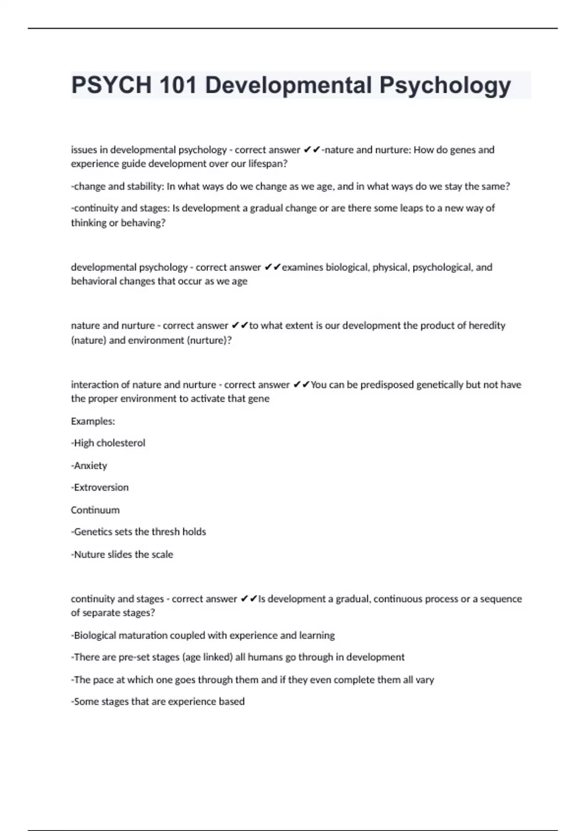 PSYCH 101 Developmental Psychology with complete solutions