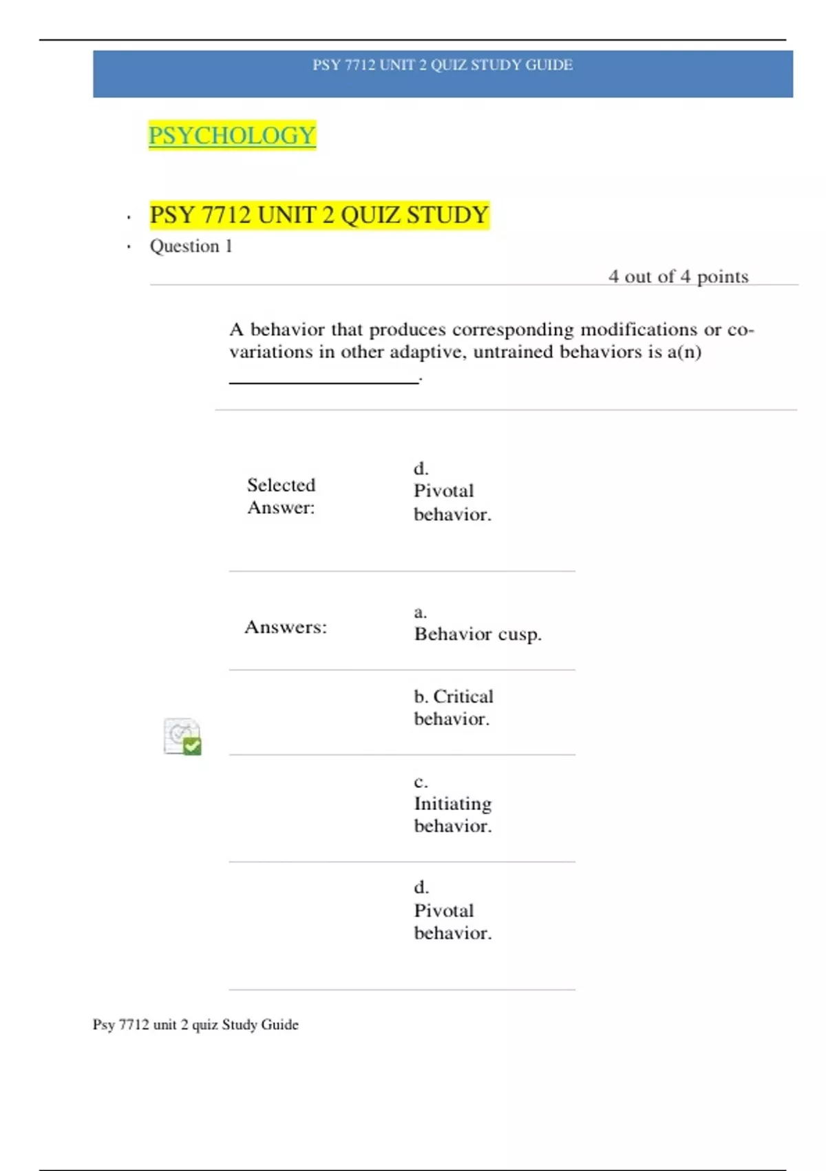 PSY 7712 UNIT 2 QUIZ STUDY GUIDE Psy 7712 unit 2 quiz Study Guide PSYCHOLOGY • PSY 7712 UNIT 2 QUIZ STUDY • Question 1 4 out of 4 points A behavior that produces corresponding modifications or covariations in other adaptive, untrained behaviors is a(n) . Selected Answer: d. Pivotal behavior. Answers: a. Behavior cusp. b. Critical behavior. c. Initiating behavior. d. Pivotal behavior. PSY 7712 UNIT 2 QUIZ STUDY GUIDE Psy 7712 unit 2 quiz Study Guide Answer Feedback: Correct. • Question 2 3 out of 3 points A descriptive and temporally sequenced account of behavior in the natural environment is called a(n): Selected Answer: a. Anecdotal observation. Answers: a. Anecdotal observation. b. Behavioral assessment. c. Ecological assessment. d. Real time observation. Answer Feedback: Correct. • Question 3 A good behavior definition includes: 4 out of 4 points Selected Answer: d. Both A and B. Answers: a. What the behavior may not include (for example, does not include spitting in the sink). b. An operational description of the behavior. c. Feelings about the behavior. d. Both A and B. e. None of the above. Answer Feedback: Correct