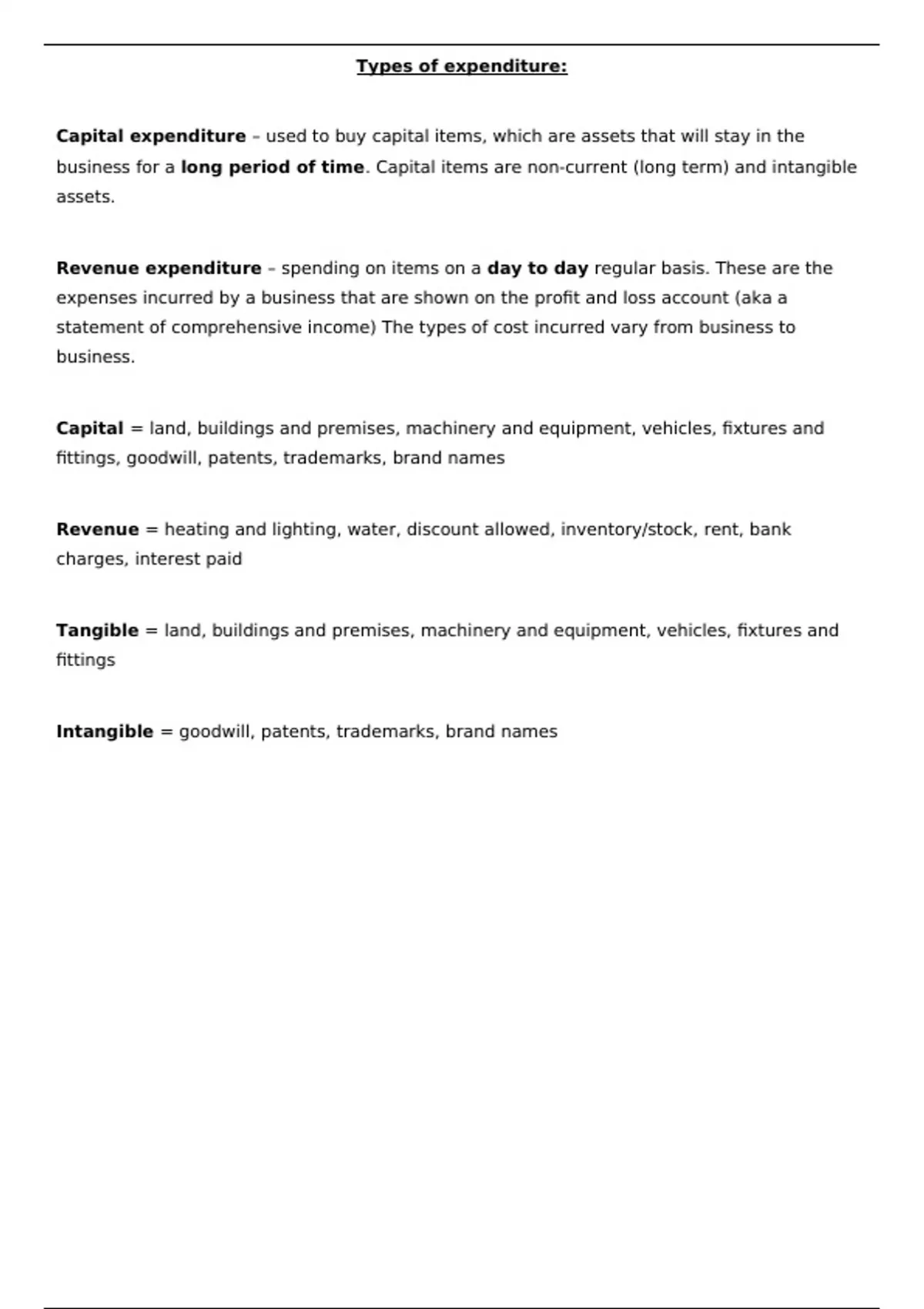 Capital expenditure – used to buy capital items, which are assets that will stay in the