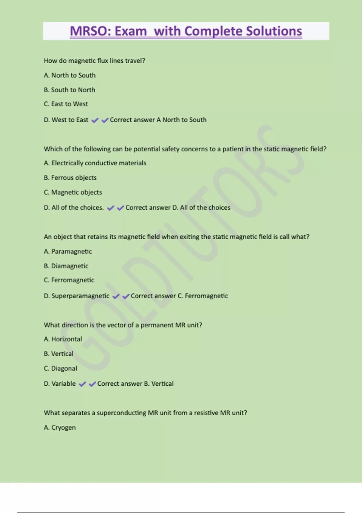 MRSO: Exam with Complete Solutions How do magnetic flux lines travel? A. North to South B. South to North C. East to West D. West to East Correct answer A North to South Which of the following can be potential safety concerns to a patient in the static magnetic field? A. Electrically conductive materials B. Ferrous objects C. Magnetic objects D. All of the choices. Correct answer D. All of the choices