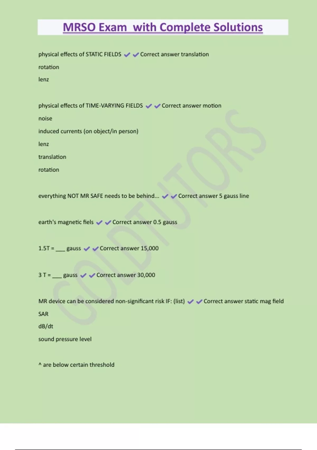 MRSO Exam with Complete Solutions physical effects of STATIC FIELDS Correct answer translation rotation lenz physical effects of TIME-VARYING FIELDS Correct answer motion noise induced currents (on object/in person) lenz translation rotation everything NOT MR SAFE needs to be behind... Correct answer 5 gauss line earth's magnetic fiels Correct answer 0.5 gauss 1.5T = ___ gauss Correct answer 15,000 3 T = ___ gauss Correct answer 30,000